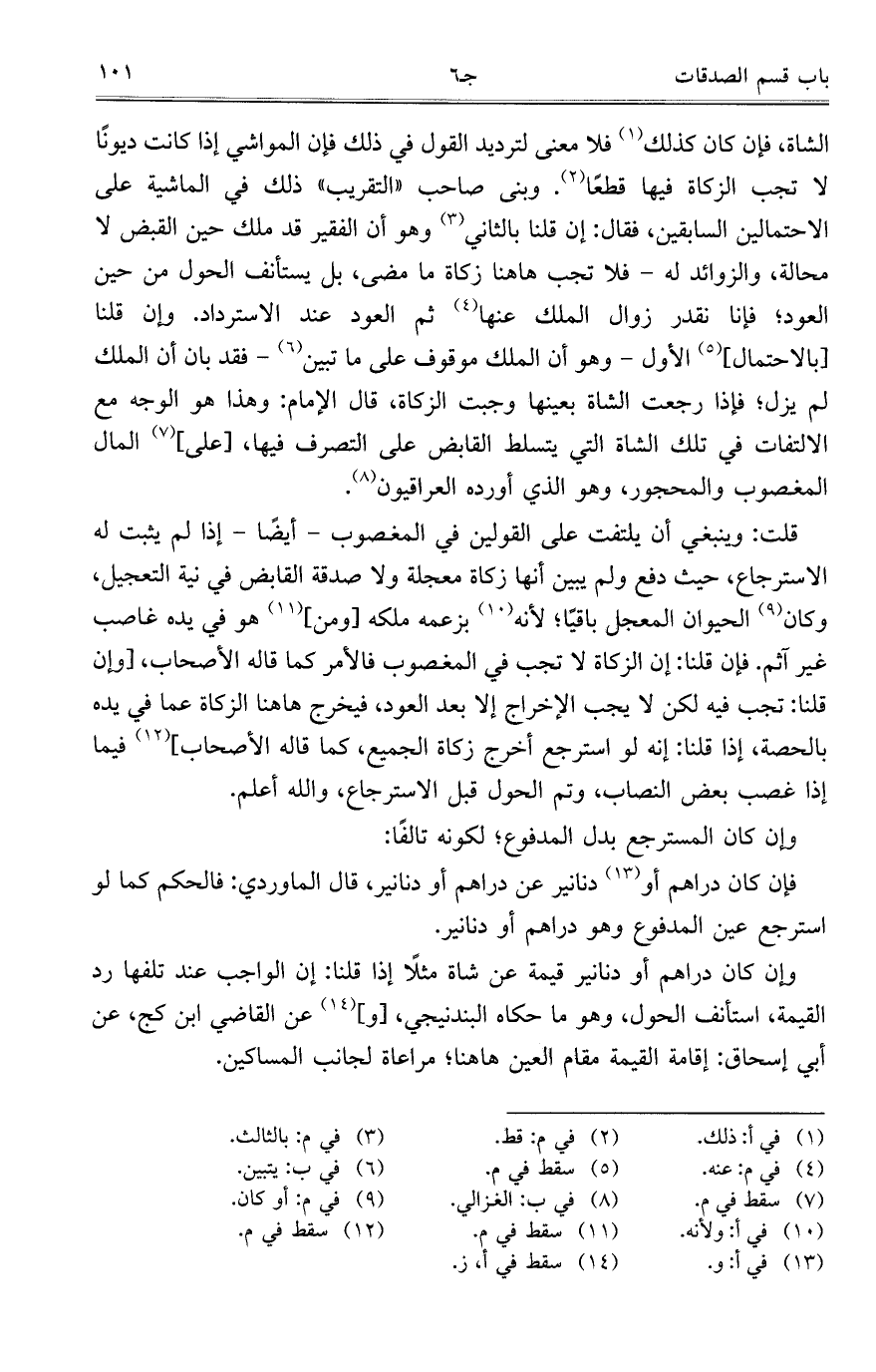الشاة، فإن كان كذلك فلا معنى لترديد القول في ذلك فن المواشي إذا كانت ديوناً لا تجب الزكاة فيها قطعاً. وبنى صاحب "التقريب" ذلك في الماشية على الاحتمالين السابقين، فقال: إن قلنا بالثاني وهو أن الفقير قد ملك حين القبض لا محالة، والزوائد له – فلا تجب هاهنا زكاة ما مضى، بل يستأنف الحول من حين العود؛ فإنا تقدر زوال الملك عنها ثم العود عند الاسترداد. وإن قلنا [بالاحتمال] الأول- وهو أن الملك موقوف على ما تبين – فقد بان أن الملك لم يزل؛ فإذا رجعت الشاة بعينها وجبت الزكاة، قال الإمام: وهذا هو الوجه مع الالتفات في تلك الشاة التي يتسلط القابض على التصرف فيها، [على] المال المغصوب والمحجور، وهو الذي أورده العراقيون.