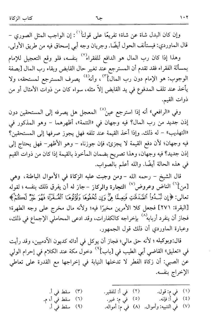 وهذا إذا كان رب المال هو الدافع للفقراء بنفسه، فلو وقع التعجيل للإمام بمسألة الفقراء فقد تقدم أن المسترجع عند تغير حال القابض وبقاء رب المال [بصفة الوجوب: هو الإمام دون رب المال]، وأنه يصرف المسترجع لمستحقه، ولا يأخذ عند تلف المدفوع في يد القابض إلا مثله، سواء كان من ذوات الأمثال أو من ذوات القيم.