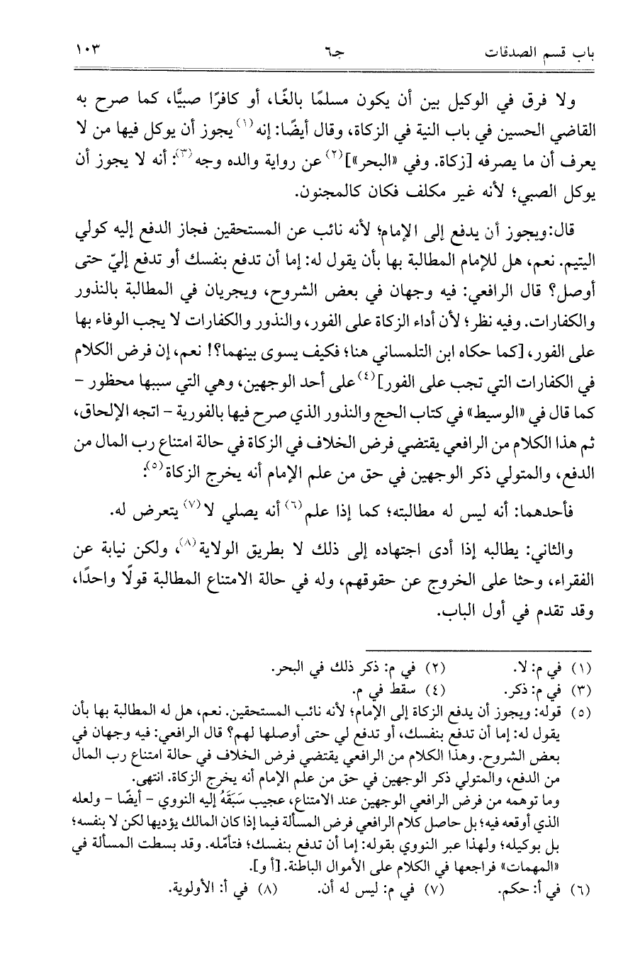 قال: ويجوز أن يدفع إلى الإمام؛ لأنه نائب عن المستحقين فجاز الدفع إليه كولي اليتيم. نعم، هل للإمام المطالبة بها بأن يقول له: إما أن تدفع بنفسك أو تدفع إليّ حتى أوصل؟ قال الرافعي: فيه وجهان في بعض الشروح، ويجريان في المطالبة بالنذور والكفارات. وفيه نظر؛ لأن أداء الزكاة على الفور، والنذور والكفارات لا يجب الوفاء بها على الفور، [كما حكاه ابن التلمساني هنا؛ فكيف يسوي بينهما؟! نعم، إن فرض الكلام في الكفارات التي تجب على الفور] على أحد الوجهين، وهي التي سببها محظور – كما قال في "الوسيط" في كتاب الحج والنذور الذي صرح فيها بالفورية – اتجه الإلحاق، ثم هذا الكلام من الرافعي يقتضي فرض الخلاف في الزكاة في حالة امتناع رب المال من الدفع، والمتولي ذكر الوجهين في حق من علم الإمام أنه يخرج الزكاة.