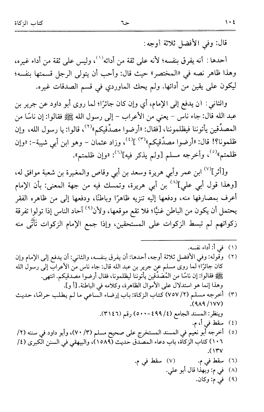 والثاني: أن يدفع إلى الإمام، أي وإن كان جائراً؛ لما روى أبو داود عن جرير بن عبد الله قال: جاء ناس – يعني من الأعراب – إلى رسول الله صلى الله عليه وسلم فقالوا: إن ناساً من المصدِّقين يأتوننا فيظلموننا، [فقال: "أرضوا مصدِّقيكم"، قالوا: يا رسول الله، وإن ظلمونا؟! قال: "أرضوا مصدِّقيكم"]، وزاد عثمان – وهو ابن أبي شيبة -: "وإن ظلمتم"، وأخرجه مسلم [ولم يذكر فيه]: "وإن ظلمتم".