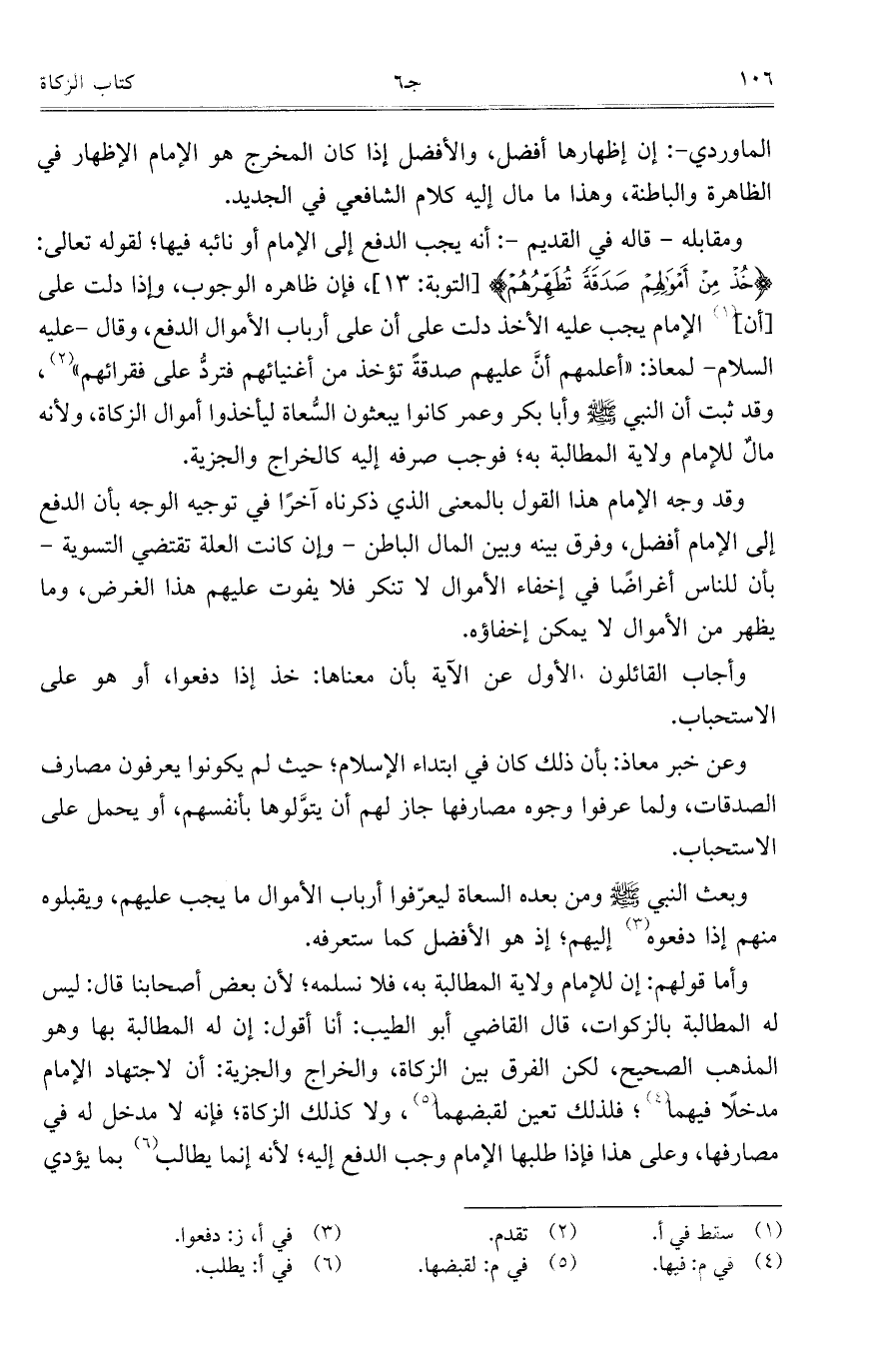 الماوردي -: إن إظهارها أفضل، والأفضل إذا كان المخرج هو الإمام الإظهار في الظاهرة والباطنة، وهذا ما مال إليه كلام الشافعي في الجديد.