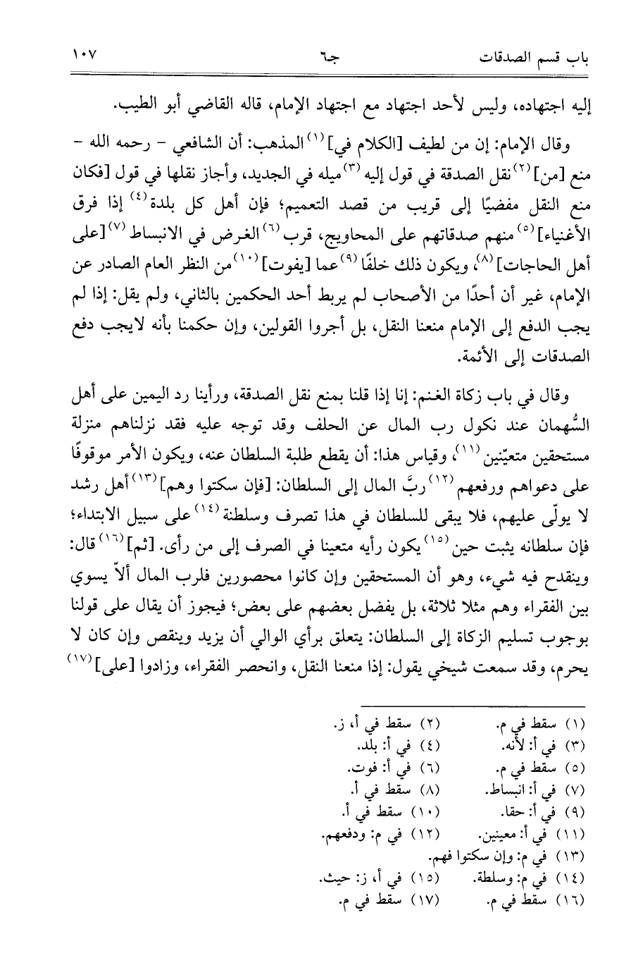 وقال الإمام: إن من لطيف [الكلام في] المذهب: أن الشافعي – رحمه الله- منع [من] نقل الصدقة في قول إليه ميله في الجديد، وأجاز نقلها في قول [فكان منع النقل مفضياً إلى قريب من قصد التعميم؛ فإن أهل كل بلدة إذا فرق الأغنياء] منهم صدقاتهم على المحاويج، قرب الغرض في الانبساط [على أهل الحاجات]،ويكون ذلك خلفاً عما [يفوت] من النظر العام الصادر عن الإمام، غير أن أحداً من الأصحاب لم يربط أحد الحكمين بالثاني، ولم يقل: إذا لمي جب الدفع إلى الإمام منعنا النقل، بل أجروا القولين، وإن حكمنا بأنه لا يجب دفع الصدقات إلى الأئمة.