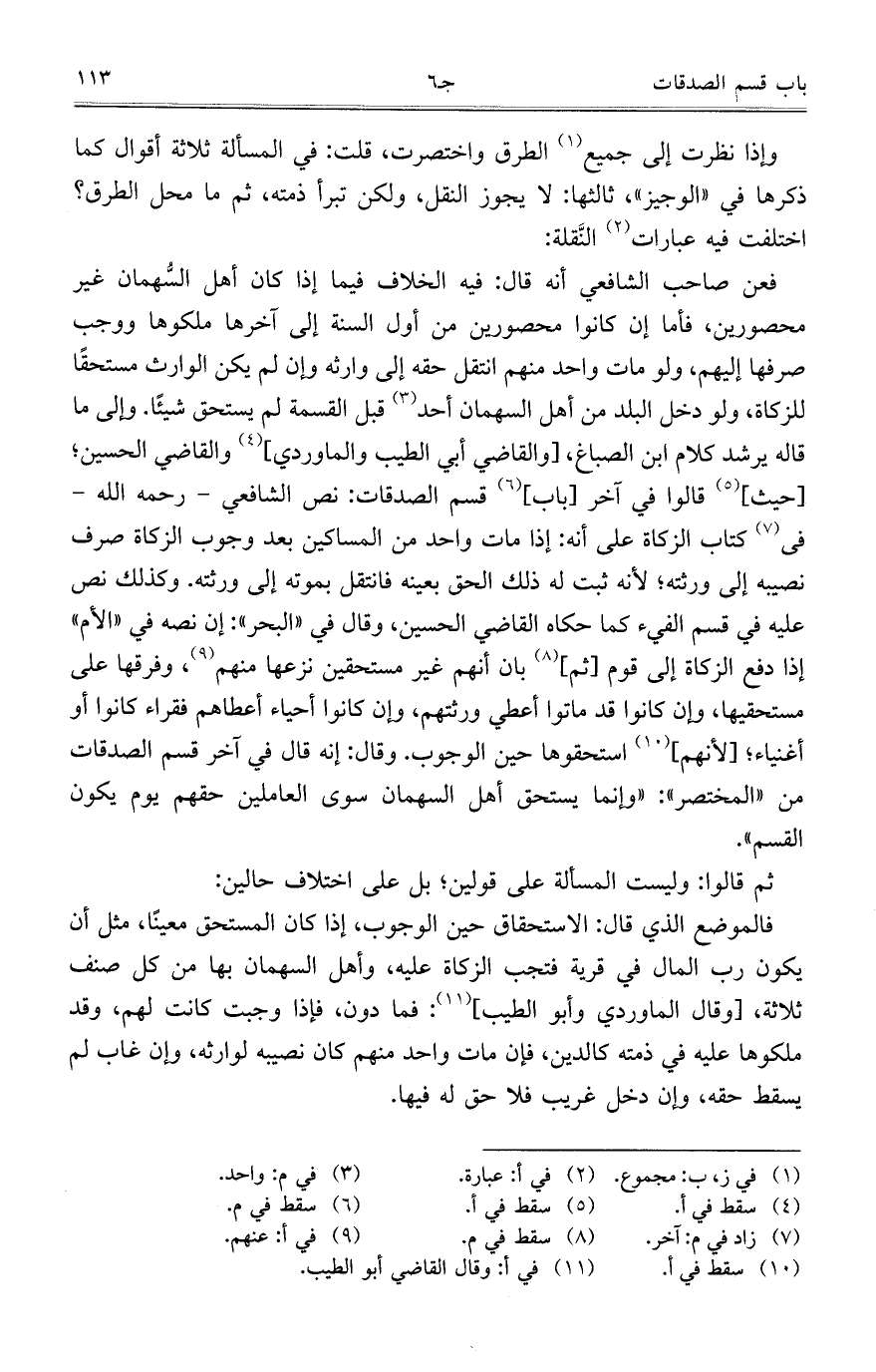 فعن صاحب الشافعي أنه قال: فيه الخلاف فيما إذا كان أهل السُّهمان غير محصورين، فأما إن كانوا محصورين من أول السنة إلى آخرها ملكوها ووجب صرفها إليهم، ولو مات واحد منهم انتقل حقه إلى وارثه وإن لم يكن الوارث مستحقاً للزكاة، ولو دخل البلد من أهل السهمان أحد قبل القسمة لم يستحق شيئاً. وإلى ما قاله يرشد كلام ابن الصباغ، [والقاضي أبي الطيب والماوردي] والقاضي الحسين؛ [حيث] قالوا في آخر [باب] قسم الصدقات: نص الشافعي – رحمه الله – في كتاب الزكاة على أنه: إذا مات واحد من المساكين بعد وجوب الزكاة صرف نصيبه إلى ورثته؛ لأنه ثبت له ذلك الحق بعينه فانتقل بموته إلى ورثته. وكذلك نص عليه في قسم الفيء كما حكاه القاضي الحسين، وقال في "البحر": إن نصه في "الأم" إذا دفع الزكاة إلى قوم [ثم] بان أنهم غير مستحقين نزعها منهم، وفرقها على مستحقيها، وإن كانوا قد ماتوا أعطي ورثتهم، وإن كانوا أحياء أعطاهم فقراء كانوا أو أغنياء؛ [لأنهم] استحقوها حين الوجوب. وقال: إنه قال في آخر قسم الصدقات من "المختصر": "وإنما يستحق أهل السهمان سوى العاملين حقهم يوم يكون القسم".