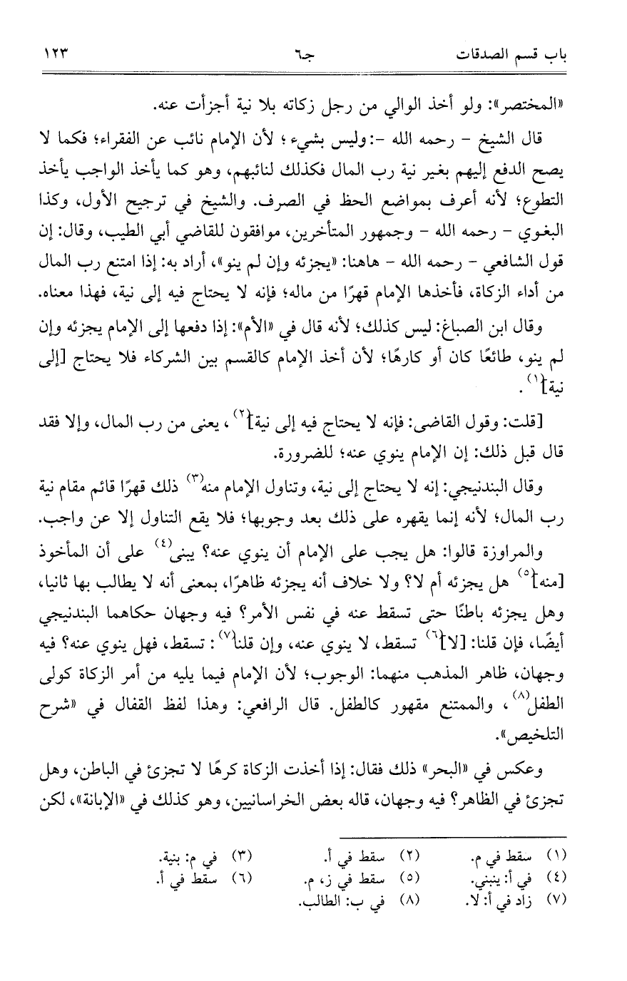 [قلت: وقول القاضي: فإنه لا يحتاج فيه إلى نية]، يعني من رب المال، وإلا فقد قال قبل ذلك: إن الإمام ينوي عنه؛ للضرورة.