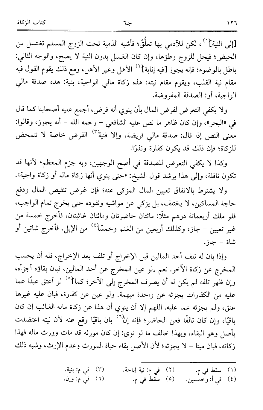 [إلى النية]، لكن للآدمي بها تعلُّقٌ؛ فأشبه الذمية تحت الزوج المسلم تغتسل من الحيض؛ فيحل للزوج وطؤها، وإن كان الغسل بدون النية لا يصح، والوجه الثاني: باطل بالوضوء؛ فإنه يجوز [فيه إنابة] الأهل وغير الأهل، ومع ذلك يقوم القول فيه مقام نية القلب، ويقوم مقام نيته: هذه زكاة مالي الواجبة، بنية: هذه صدقة مالي الواجبة، أو: الصدقة المفروضة.