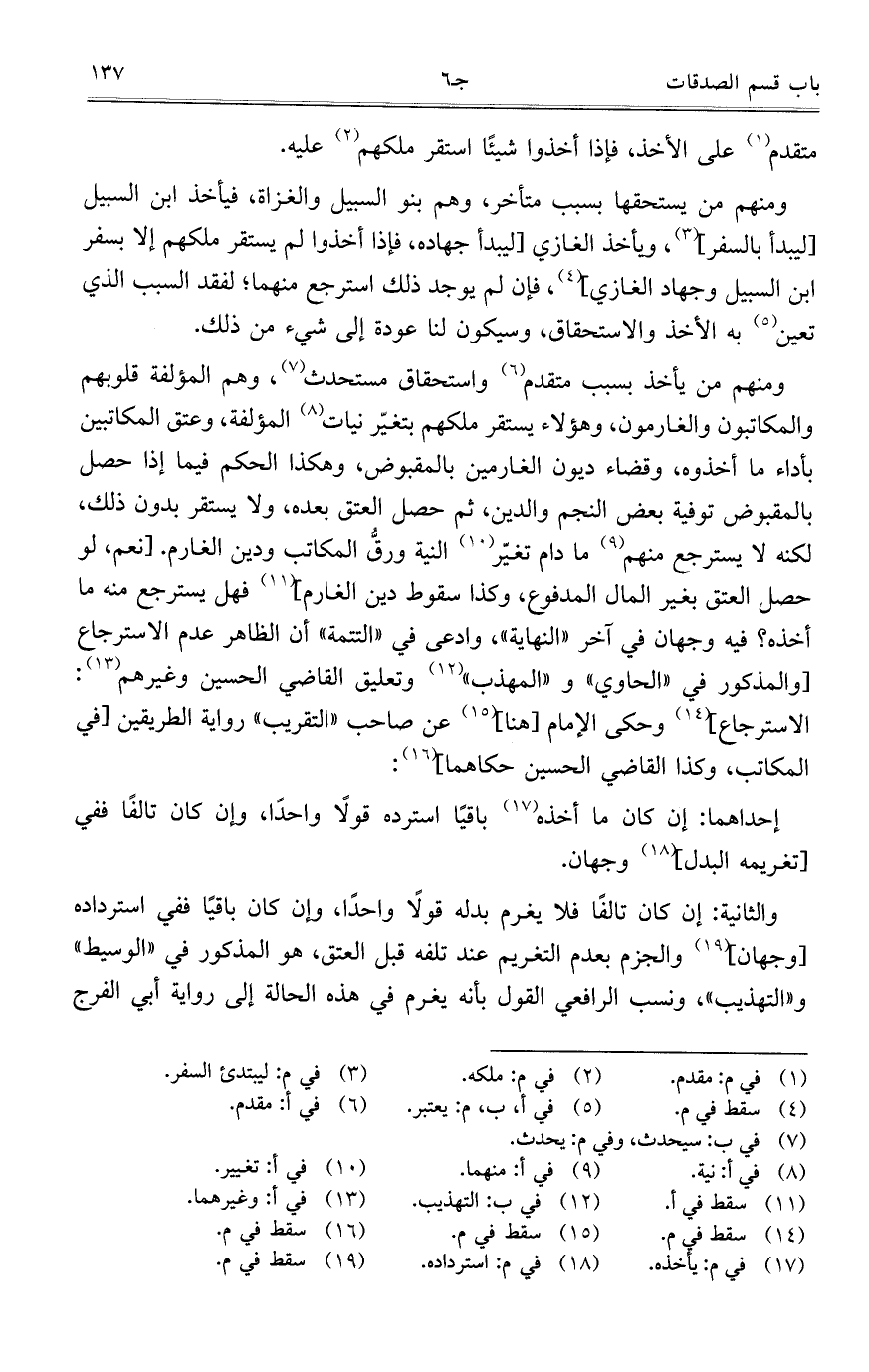 ومنهم من يأخذ بسبب متقدم واستحقاق مستحدث، وهم المؤلفة قلوبهم والمكاتبون والغارمون، وهؤلاء يستقر ملكهم بتغير نيات المؤلفة، وعتق المكاتبين بأداء ما أخذوه، وقضاء ديون الغارمين بالمقبوض، وهكذا الحكم فيما إذا حصل بالمقبوض توفية بعض النجم والدين، ثم حصل العتق بعده، ولا يستقر بدون ذلك، لكنه لا يسترجع منهم ما دام تغيّر النية ورقُّ المكاتب ودين الغارم. [نعم، لو حصل العتق بغير المال المدفوع، وكذا سقوط دين الغارم] فهل يسترجع منه ما أخذه؟ فيه وجهان في آخر "النهاية"، وادعى في "التتمة" أن الظاهر عدم الاسترجاع [والمذكور في "الحاوي" و"المهذب" وتعليق القاضي الحسين وغيرهم: الاسترجاع] وحكى الإمام [هنا] عن صاحب "التقريب" رواية الطريقين [في المكاتب، وكذا القاضي الحسين حكاهما]: