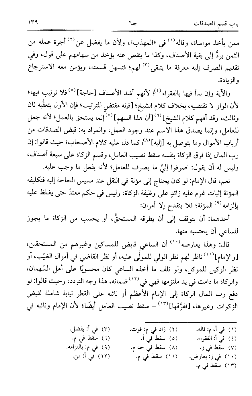 والآية وإن بدأ فيها بالفقراء؛ لأنهم أشد الأصناف [حاجة] فلا ترتيب فيها؛ لأن الواو لا تقتضيه، بخلاف كلام الشيخ؛ [فإن مقتضٍ للترتيب؛ فإن الأول يتعقَّبه ثان وثالث، وقد أفهم كلام الشيخ] [أن هذا السهم] إنما يستحق بالعمل؛ لأنه جعل للعامل، وإنما يصدق هذا الاسم عند وجود العمل، والمراد به: قبض الصدقات من أرباب الأموال وما يتوصل به [إليه]، كما دل عليه كلام الأصحاب؛ حيث قالوا: إن رب المال إذا فرق الزكاة بنفسه سقط نصيب العامل، وقسم الزكاة على سبعة أصناف، وليس له أن يقول: اصرفوا إليَّ ما يصرف للعامل؛ لأنه يفعل ما وجب عليه.