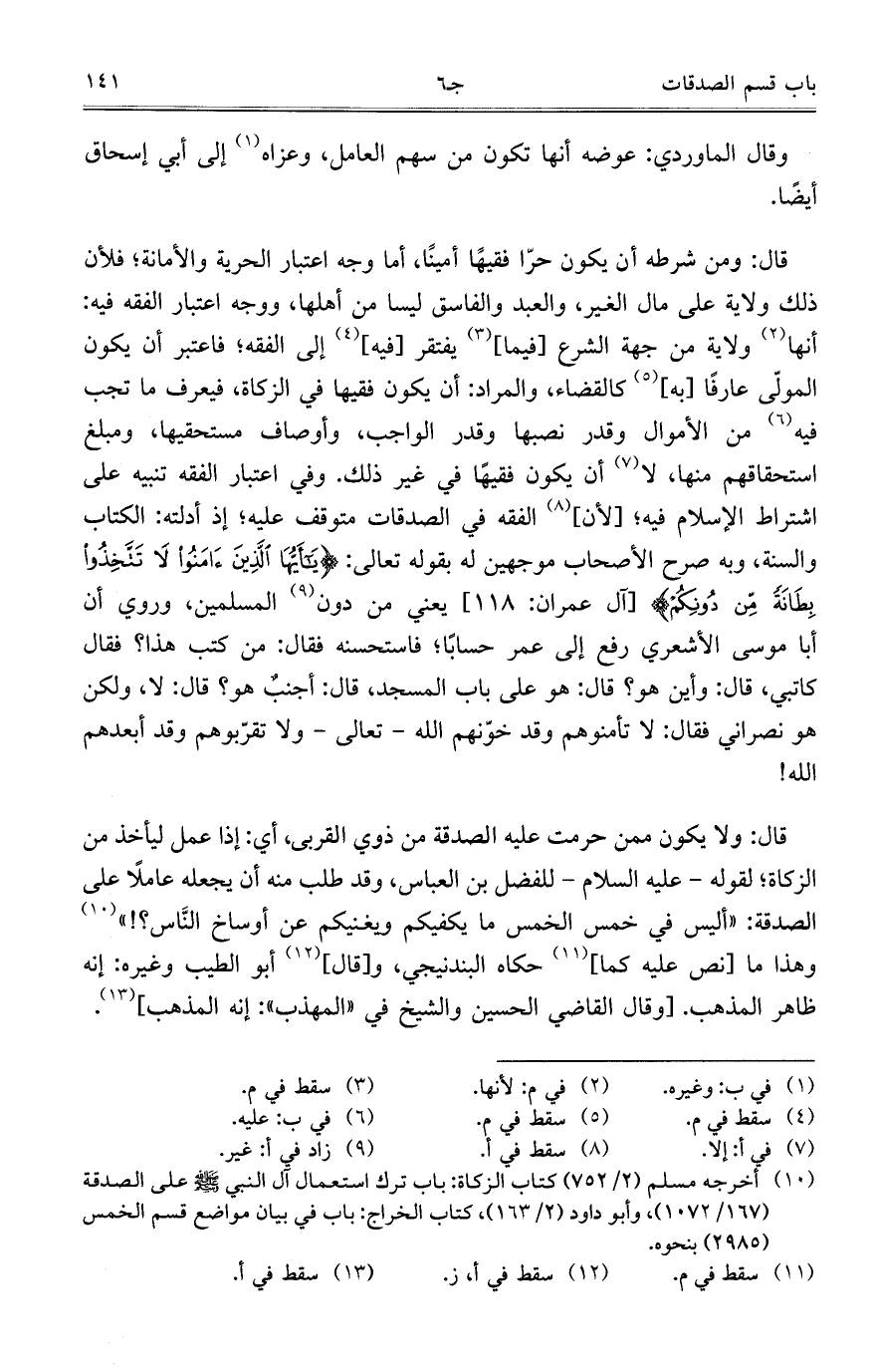 قال: ومن شرطه أن يكون حرّا فقيهاً أميناً، أما وجه اعتبار الحرية والأمانة؛ فلأن ذلك ولاية على مال الغير، والعبد والفاسق ليسا من أهلها، ووجه اعتبار الفقه فيه: أنها ولاية من جهة الشرع [فيما] يفتقر [فيه] إلى الفقه؛ فاعتبر أن يكون المولى عارفاً [به] كالقضاء، والمراد: أن يكون فقيهاً في الزكاة، فيعرف ما تجب فيه من الأموال وقدر نصبها وقدر الواجب، وأوصاف مستحقيها، ومبل استحقاقهم منها، لا أن يكون فقيهاً في غير ذلك. وفي اعتبار الفقه تنبيه على اشتراط الإسلام فيه؛ [لأن] الفقه في الصدقات متوقف عليه؛ إذ أدلته: الكتاب والسنة، وبه صرح الأصحاب موجهين له بقوله تعالى: {يَا أَيُّهَا الَّذِينَ آمَنُوا لا تَتَّخِذُوا بِطَانَةً مِنْ دُونِكُمْ} [آل عمران: 118] يعني من دون المسلمين، وروي أن أبا موسى الأشعري رفع إلى عمر حساباً؛ فاستحسنه فقال: من كتب هذا؟ فقال كاتبي، قال: وأين هو؟ قال: هو على باب المسجد، قال: أجنبٌ هو؟ قال: لا، ولكن هو نصراني فقال: لا تأمنوهم وقد خوّنهم الله – تعالى- ولا تقرّبوهم وقد أبعدهم الله!