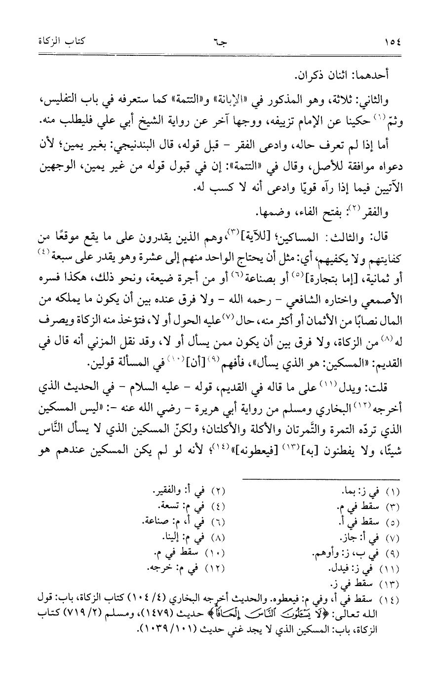 قلت: ويدل على ما قاله في القديم، قوله – عليه السلام- في الحديث الذي أخرجه البخاري ومسلم من رواية أبي هريرة – رضي الله عنه -:"ليس المسكين الذي تردّه التمرة والتَّمرتان والأكلة والأكلتان؛ ولكنّ المسكين الذي لا يسأل النَّاس شيئاً، ولا يفطنون [به] [فيعطونه] "؛ لأنه لو لم يكن المسكين عندهم هو