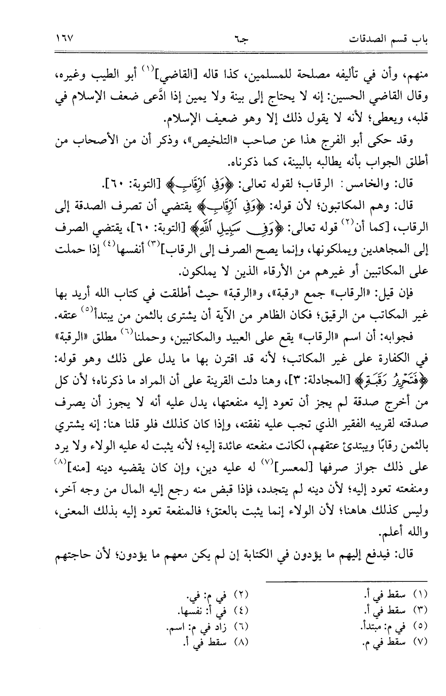 قال: وهم المكاتبون؛ لأن قوله: {وَفِي الرِّقَابِ} يقتضي أن تصرف الصدقة إلى الرقاب، [كما أن قوله تعالى: {وَفِي سَبِيلِ اللَّهِ} [التوبة: 60]، يقتضي الصرف إلى المجاهدين ويملكونها، وإنما يصح الصرف إلى الرقاب] أنفسها إذا حملت على المكاتبين أو غيرهم من الأرقاء الذين لا يملكون.