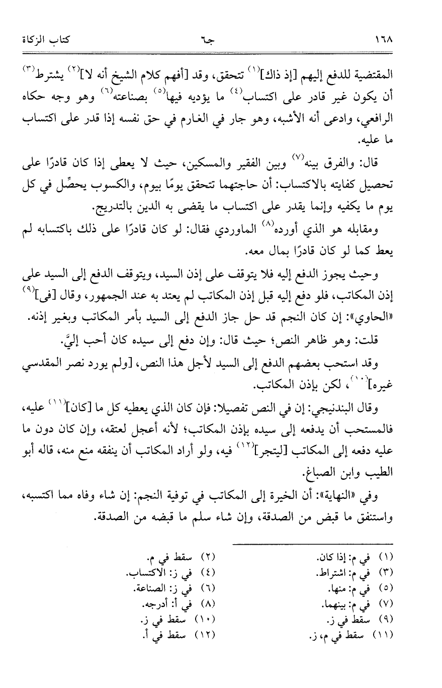 المقتضية للدفع إليهم [إذ ذاك] تتحقق، وقد [أفهم كلام الشيخ أنه لا] يشترط أن يكون غير قادر على اكتساب ما يؤديه فيها بصناعته وهو وجه حكاه الرافعي، وادعى أنه الأشبه، وهو جار في الغارم في حق نفسه إذا قدر على اكتساب ما عليه.