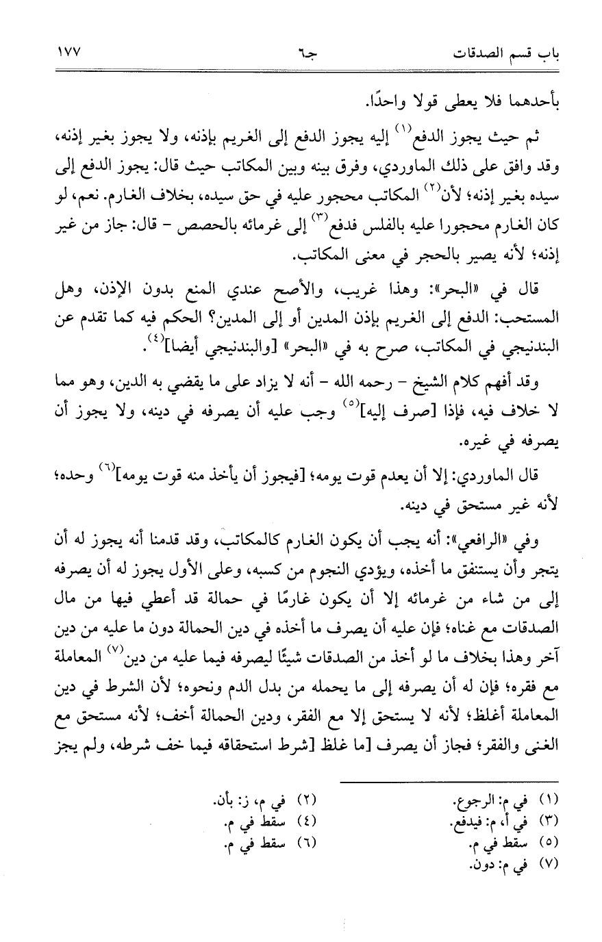 ثم حيث يجوز الدفع إليه يجوز الدفع إلى الغريم بإذنه، ولا يجوز بغير إذنه، وقد وافق على ذلك الماوردي، وفرق بينه وبين المكاتب حيث قال: يجوز الدفع إلى سيده بغير إذنه؛ لأن المكاتب محجور عليه في حق سيده، بخلاف الغارم. نعم، لو كان الغارم محجوراً عليه بالفلس فدفع إلى غرمائه بالحصص – قال: جاز من غير إذنه؛ لأنه يصير بالحجر في معنى المكاتب.