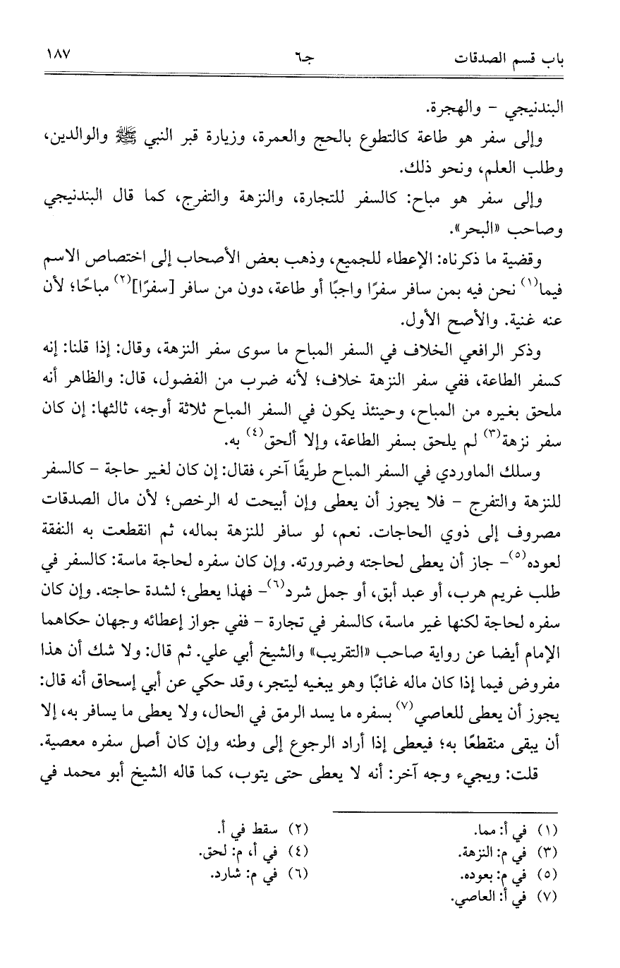 وسلك الماوردي في السفر المباح طريقاً آخر، فقال: إن كان لغير حاجة – كالسفر للنزهة والتفرج – فلا يجوز أن يعطى وإن أبيحت له الرخص؛ لأن مال الصدقات مصروف إلى ذوي الحاجات. نعم، لو سافر للنزهة بماله، ثم انقطعت به النفقة لعوده- جاز أن يعطى لحاجته وضرورته. وإن كان سفره لحاجة ماسة: كالسفر في طلب غريم هرب، أو عبد أبق، أو جمل شرد فهذا يعطى؛ لشدة حاجته. وإن كان سفره لحاجة لكنها غير ماسة، كالسفر في تجارة – ففي جواز إعطائه وجهان حكاهما الإمام أيضاً عن رواية صاحب "التقريب" والشيخ أبي علي. ثم قال: ولا شك أن هذا مفروض فيما إذا كان ماله غائباً وهو يبغيه ليتجر، وقد حكى عن أبي إسحاق أنه قال: يجوز أن يعطى للعاصي بسفره ما يسد الرمق في الحال، ولا يعطى ما يسافر به، إلا أن يبقى منقطعاً به؛ فيعطى إذا أراد الرجوع إلى وطنه وإن كان أصل سفره معصية.