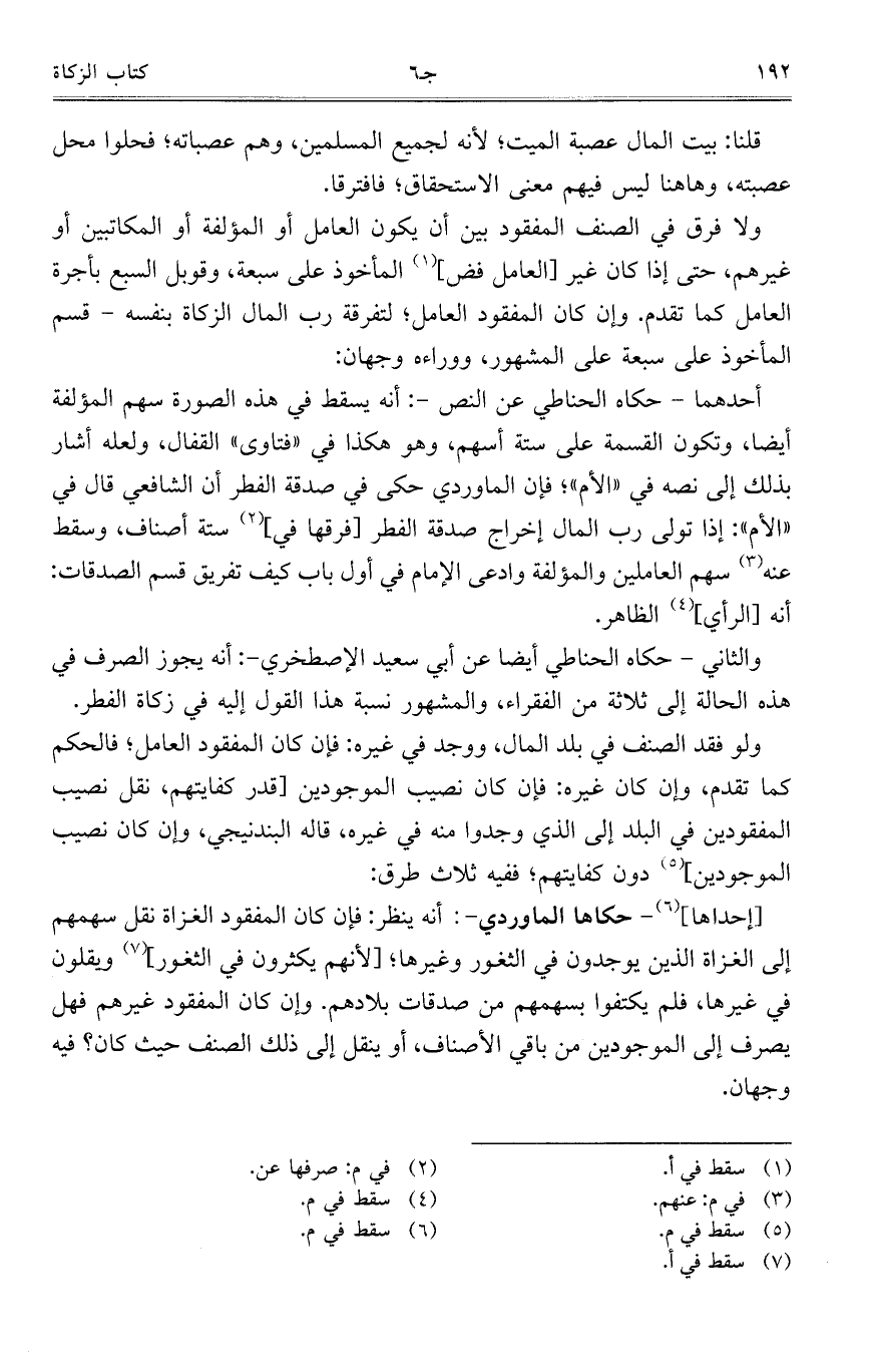 ولا فرق في الصنف المفقود بين أن يكون العامل أو المؤلفة أو المكاتبين أو غيرهم، حتى إذا كان غير [العامل فض] المأخوذ على سبعة، وقوبل السبع بأجرة العامل كما تقدم. وإن كان المفقود العامل؛ لتفرقة رب المال الزكاة بنفسه – قسم المأخوذ على سبعة على المشهور، ووراءه، وجان: