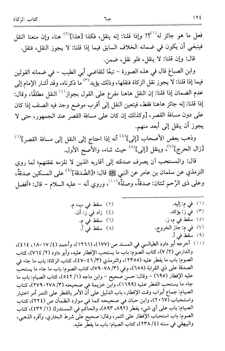 وابن الصباغ قال في هذه الصورة- تبعاً للقاضي أبي الطيب – في ضمانه القولين فيما إذا قلنا: لا يجوز نقل الزكاة فنقلها، وذلك يؤيد ما ذكرناه، وقد أشار الإمام إلى عدم الضمان إذا قلنا: إن النقل هاهنا مفرع على القول بجواز النقل مطلقاً، وقال: إذا قلنا: إنه جائز هاهنا فقط، فيتعين النقل إلى أقرب موضع وجد فيه الصنف إذا كان على دون مسافة القصر، [وكذلك إن كان على مسافة القصر عند الجمهور، حتى لا يجوز أن ينقل إلى أبعد منهم.