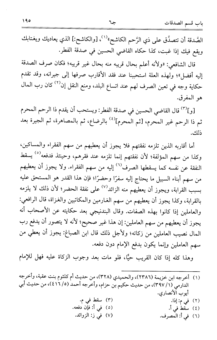 [و] قال القاضي الحسين في صدقة الفطر: ويستحب أن يقدم ذا الرحم المحرم ثم ذا الرحم غير المحرم، [ثم المحرم] بالرضاع، ثم بالمصاهرة، ثم الجيرة بعد ذلك.