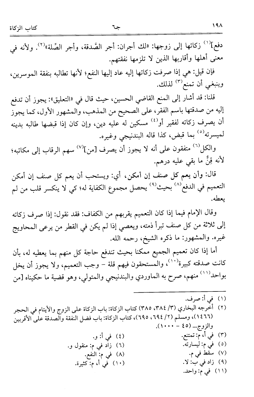 وقال الإمام فيما إذا كان التعميم يقربهم من الكفاف: فقد نقول: إذا صرف زكاته إلى ثلاثة من كل صنف تبرأ ذمته، ويعصي إذا لم يكن في القطر من يرعى المحاويج غيره. والمشهور: ما ذكره الشيخ، رحمه الله.