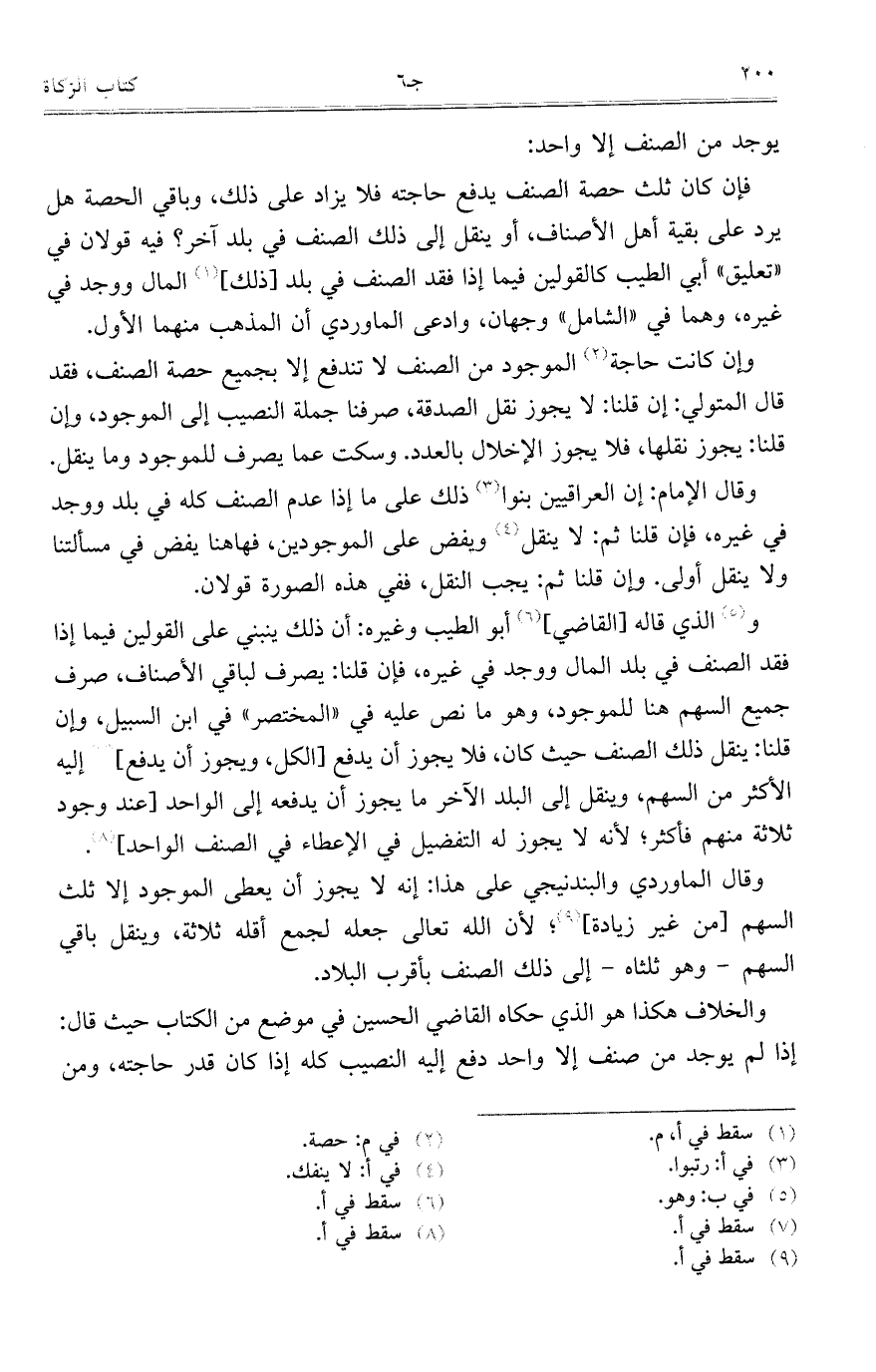 وقال الماوردي والبندنيجي على هذا: إنه لا يجوز أن يعطى الموجود إلا ثلث السهم [من غير زيادة]؛ لأن الله تعالى جعله لجمع أقله ثلاثة، وينقل باقي السهم – وهو ثلثاه – إلى ذلك الصنف بأقرب البلاد.