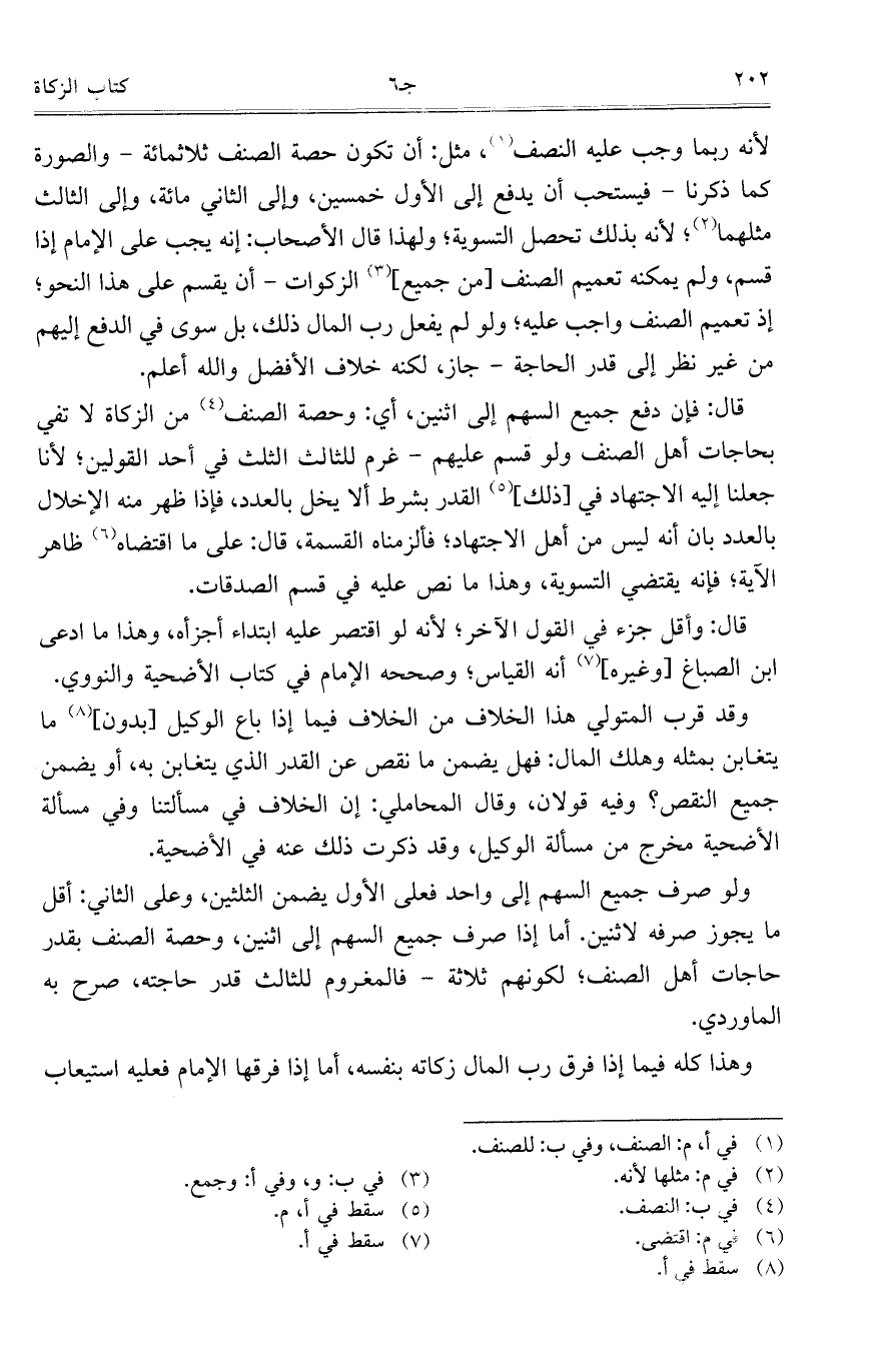 ولو صرف جميع السهم إلى واحد فعلى الأول يضمن الثلثين، وعلى الثاني: أقل ما يجوز صرفه لاثنين. أما إذا صرف جميع السهم إلى اثنين، وحصة الصنف بقدر حاجات أهل الصنف؛ لكونهم ثلاثة – فالمغروم للثالث قدر حاجته، صرح به الماوردي.
