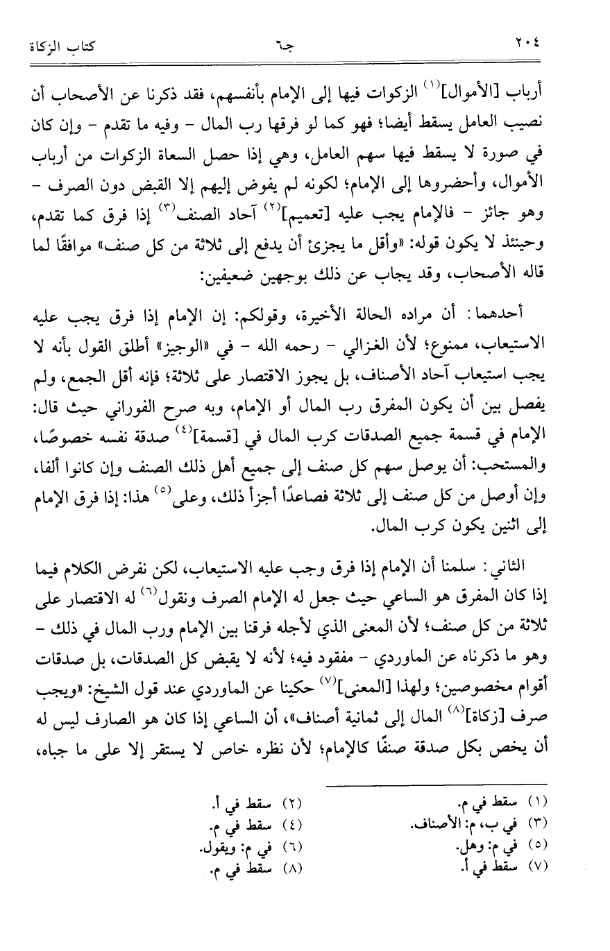 أرباب [الأموال] الزكوات فيها إلى الإمام بأنفسهم، فقد ذكرنا عن الأصحاب أن نصيب العامل يسقط أيضاً؛ فهو كما لو فرقها رب المال- وفيه ما تقدم – وإن كان في صورة لا يسقط فيها سهم العامل، وهي إذا حصل السعاة الزكوات من أرباب الأموال، وأحضروها إلى الإمام؛ لكونه لم يفوض إليهم إلا القبض دون الصرف – وهو جائز – فالإمام يجب عليه [تعميم] آحاد الصنف إذا فرق كما تقدم، وحينئذ لا يكون قوله: "وأقل ما يجزئ أن يدفع إلى ثلاثة من كل صنف" موافقاً لما قاله الأصحاب، وقد يجاب عن ذلك بوجهين ضعيفين: