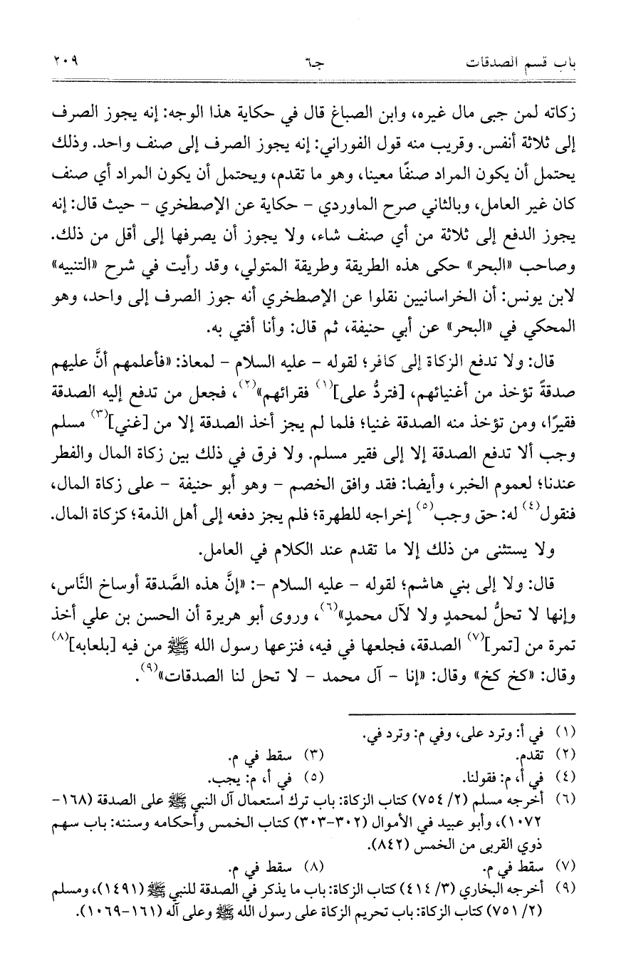 قال: ولا إلى بني هاشم؛ لقوله – عليه السلام -:"إنَّ هذه الصَّدقة أوساخ النَّاس، إنها لا تحلُّ لمحمدٍ ولا لآل محمدٍ"، وروى أبو هريرة أن الحسن بن علي أخذ تمرة من [تمر] الصدقة، فجعلها في فيه، فنزعها رسول الله صلى الله عليه وسلم من فيه [بلعابه] وقال: "كخ كخ" وقال: "إنا – آل محمد – لا تحل لنا الصدقات".