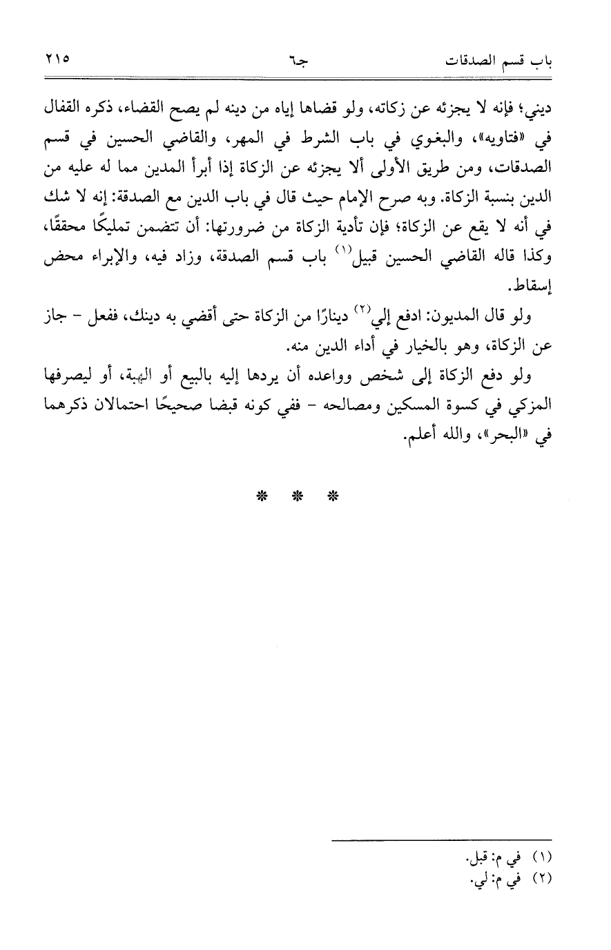 ديني؛ فإنه لا يجزئه عن زكاته، ولو قضاها إياه من دينه لم يصح القضاء، ذكره القفال في "فتاويه"، والبغوي في باب الشرط في المهر، والقاضي الحسين في قسم الصدقات، ومن طريق الأولى ألا يجزئه عن الزكاة إذا أبرأ المدين مما له عليه من الدين بنسبة الزكاة. وبه صرح الإمام حي قال في باب الدين مع الصدقة: إنه لاشك في أنه لا يقع عن الزكاة؛ فإن تأدية الزكاة من ضرورتها: أن تتضمن تمليكاً محققاً، وكذا قاله القاضي الحسين قبيل باب قسم الصدقة، وزاد فيه، والإبراء محض إسقاط.