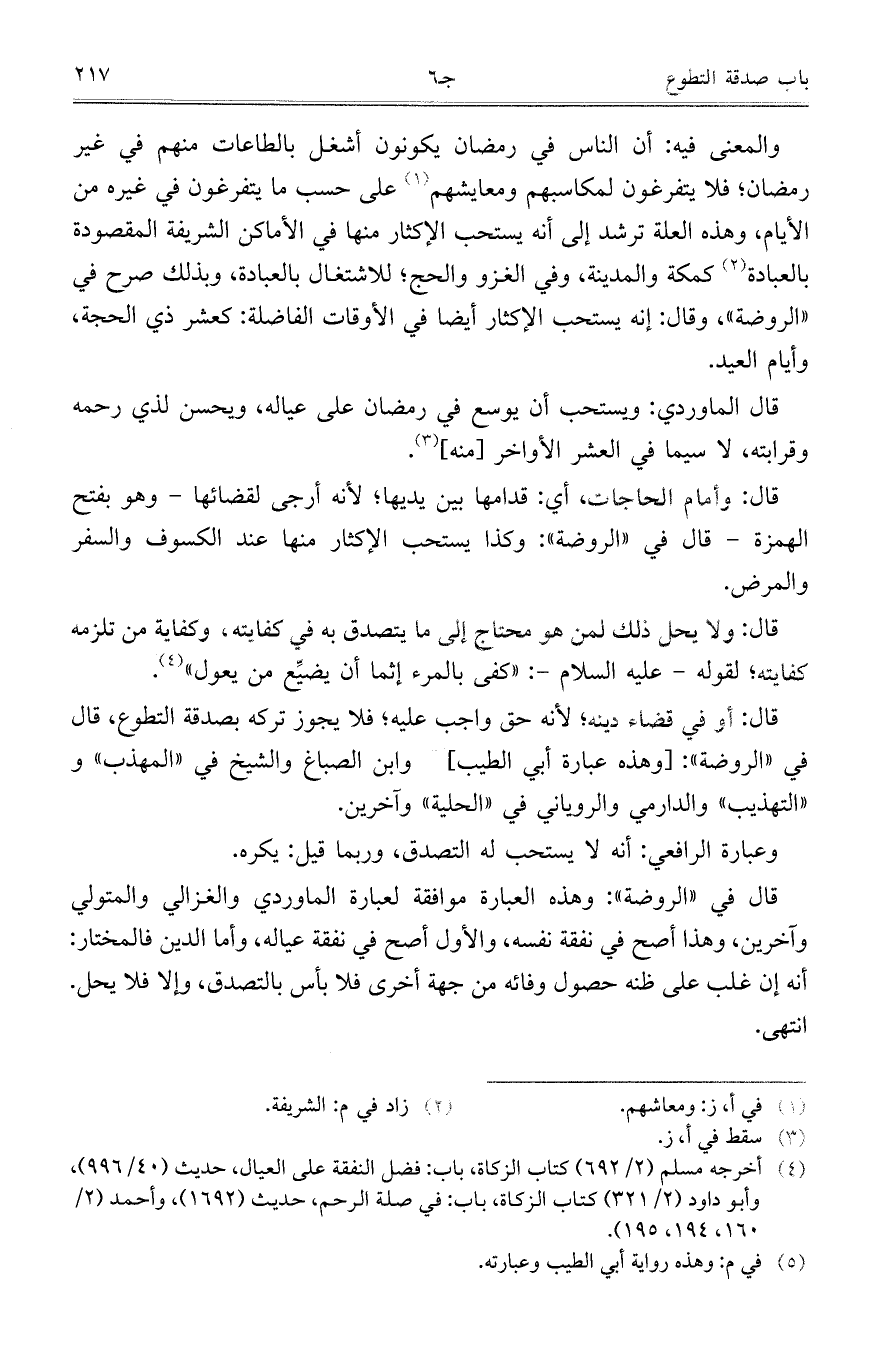 قال: ولا يحل ذلك لمن هو محتاج إلى ما يتصدق به في كفايته، وكفاية من تلزمه كفايته؛ لقوله – عليه السلام -: "كفى بالمرء إثماً أن يضيِّع من يعول".