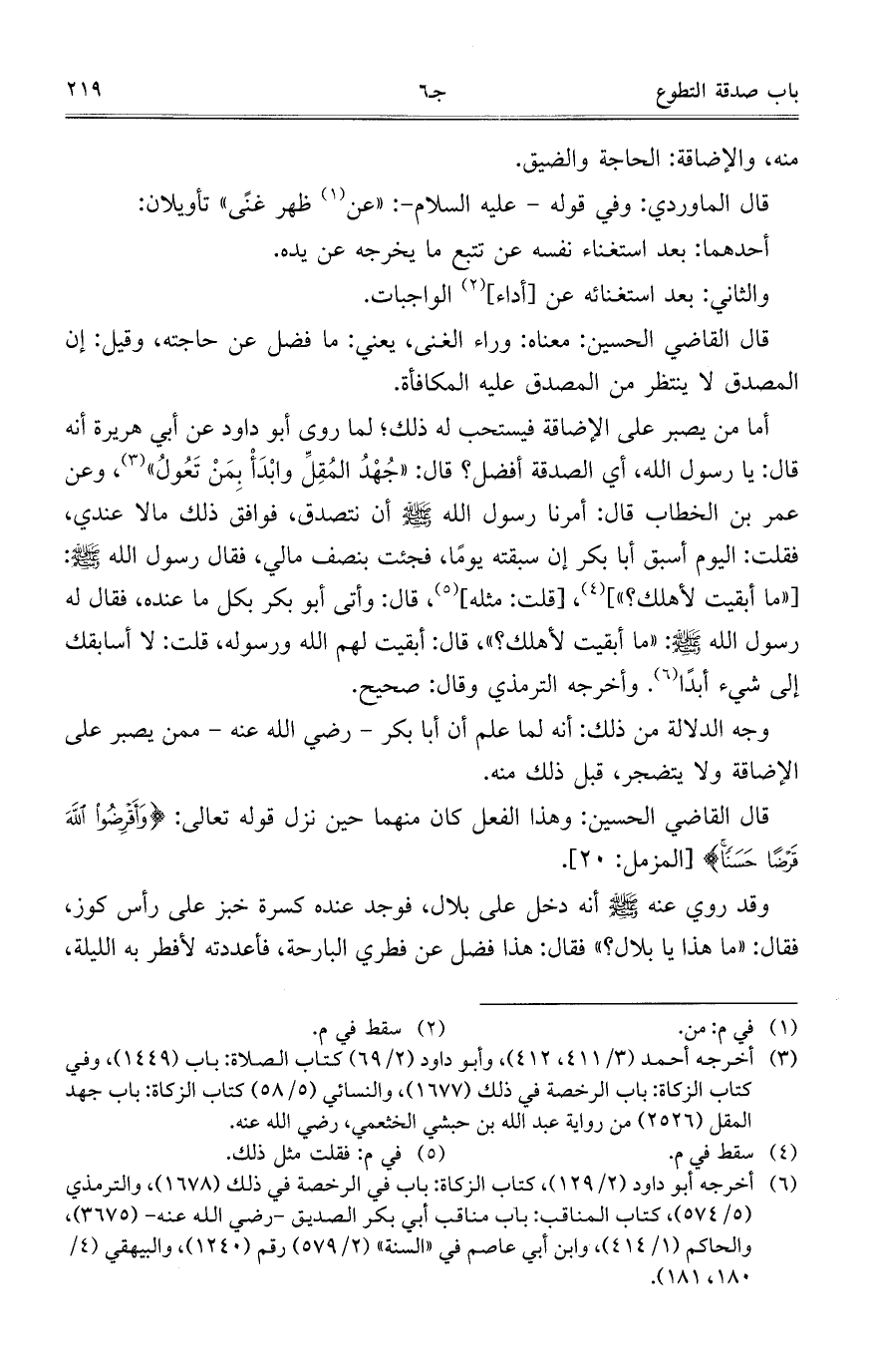 أما من يصبر على الإضافة فيستحب له ذلك؛ لما روى أبو داود عن أبي هريرة أنه قال: يا رسول الله، أي الصدقة أفضل؟ قال: "جُهْدُ المُقِلِّ وابْدَا بِمَنْ تَعُولُ"، وعن مر بن الخطاب قال: أمرنا رسول الله صلى الله عليه وسلم أن نتصدق، فوافق ذلك ما لا عندي، فقلت: اليوم أسبق أبا بكر إن سبقته يوماً، فجئت بنصف مالي، فقال رسول الله صلى الله عليه وسلم: ["ما أبقيت لأهلك؟ "]، [قلت: مثله]، قال: وأتى أبو بكر بكل ما عنده، فقال له رسول الله صلى الله عليه وسلم: "ما أبقيت لأهلك؟ "، قال: أبقيت لهم الله ورسوله، قلت: لا أسابقك إلى شيء أبداً. وأخرجه الترمذي وقال: صحيح.
