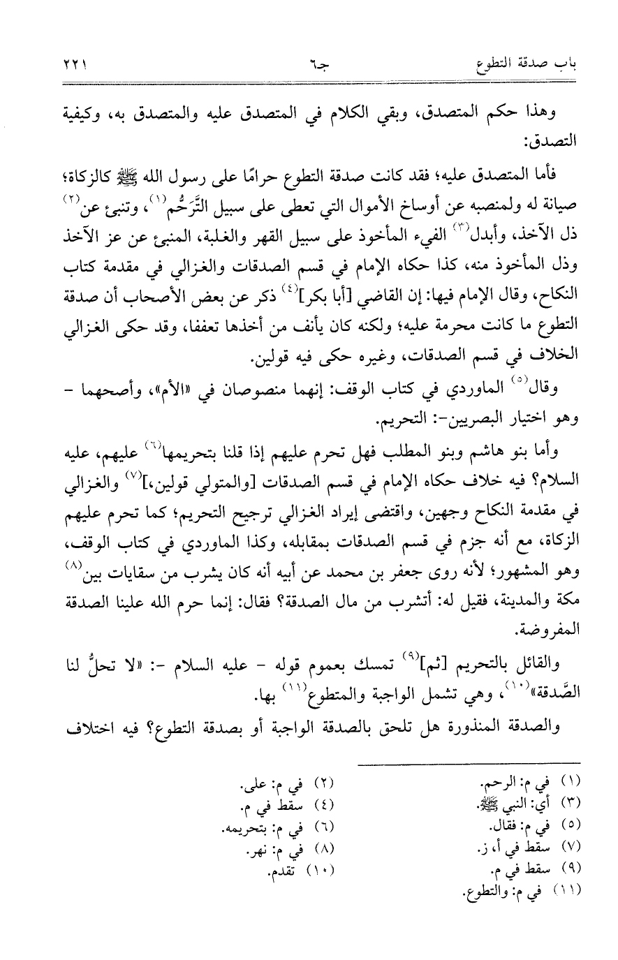 والقائل بالتحريم [ثم] تمسك بعموم قوله – عليه السلام -:"لا تحلُّ لنا الصَّدقة"، وهي تشمل الواجبة والمتطوع بها.