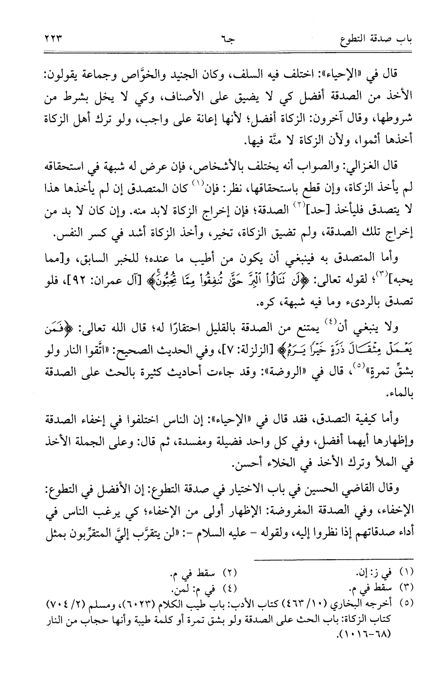 قال في "الإحياء": اختلف فيه السلف، وكان الجنيد والخوَّاص وجماعة يقولون: الأخذ من الصدقة أفضل كي لا يضيق على الأصناف، وكي لا يخل بشرط من شروطها، وقال آخرون: الزكاة أفضل؛ لأنها إعانة على واجب، ولو ترك أهل الزكاة أخذها أثموا، ولأن الزكاة لا منَّة فيها.