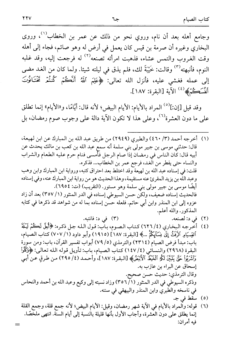 وجامع أهله بعد أن نام، وروي نحو من ذلك عن عمر بن الخطاب، وروى البخاري وغيره أن صرمة بن قيس كان يعمل في أرض له وهو صائم، فجاء إلى أهله وقت الغروب والتمس عشاء، فذهبت امرأته تصنعه له فرجعت إليه، وقد غلبه النوم، فأنبهته وقالت: خَيْبَةً لك، فلم يذق في ليلته شيئاً. ولما كان من الغد مضى إلى عمله فغشي عليه، فأنزل الله تعالى: {عَلِمَ اللَّهُ أَنَّكُمْ كُنتُمْ تَخْتَانُونَ أَنفُسَكُمْ} الآية [البقرة: 187].