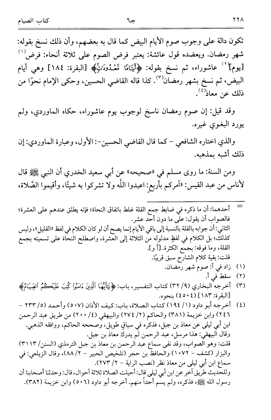 تكون دالة على وجوب صوم الأيام البيض كما قال به بعضهم، وأن ذلك نسخ بقوله: شهر رمضان. ويعضده قول عائشة: يعتبر فرض الصوم على ثلاثة أنحاء: فرض [يوم] عاشوراء، ثم نسخ بقوله: {أَيَّاماً مَعْدُودَاتٍ} [البقرة: 184] وهي أيام البيض، ثم نسخ بشهر رمضان. كذا قاله القاضي الحسين، وحكى الإمام نحواً من ذلك عن معاذ.
