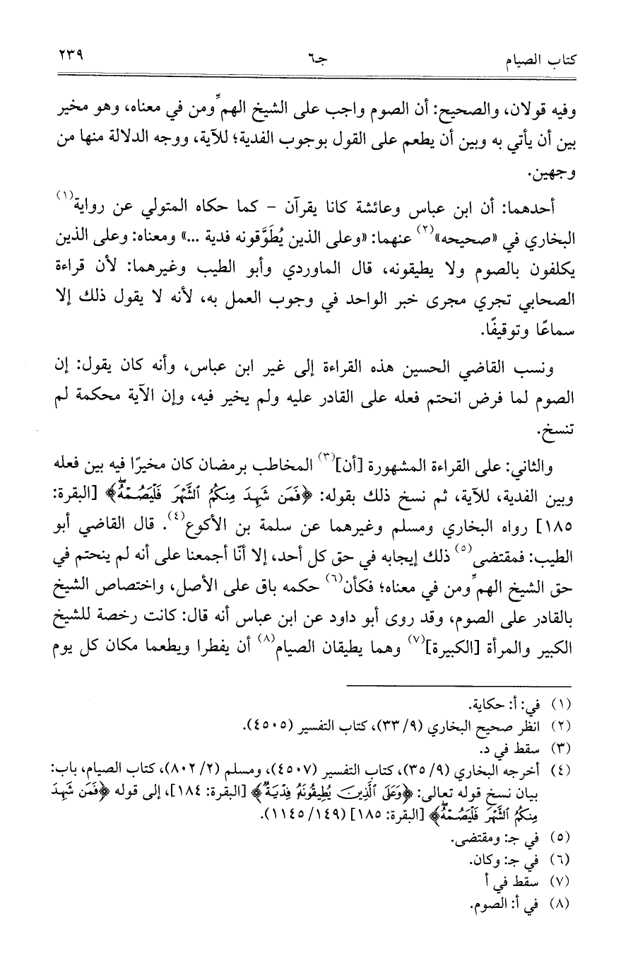 والثاني: على القراءة المشهورة [أن] المخاطب برمضان كان مخيراً فيه بين فعله وبين الفدية، للآية، ثم نسخ ذلك بقوله: {فَمَنْ شَهِدَ مِنْكُمْ الشَّهْرَ فَلْيَصُمْهُ} [البقرة: 185] رواه البخاري ومسلم وغيرهما عن سلمة بن الأكوع. قال القاضي أبو الطيب: فمقتضى ذلك إيجابه في حق كل أحد، إلا أنَّا أجمعنا على أنه لم ينحتم في حق الشيخ الهم ومن في معناه؛ فكأن حكمه باق على الأصل، واختصاص الشيخ بالقادر على الصوم، وقد روى أبو داود عن ابن عباس أنه قال: كانت رخصة للشيخ الكبير والمرأة [الكبيرة] وهما يطيقان الصيام أن يفطرا ويطعما مكان كل يوم
