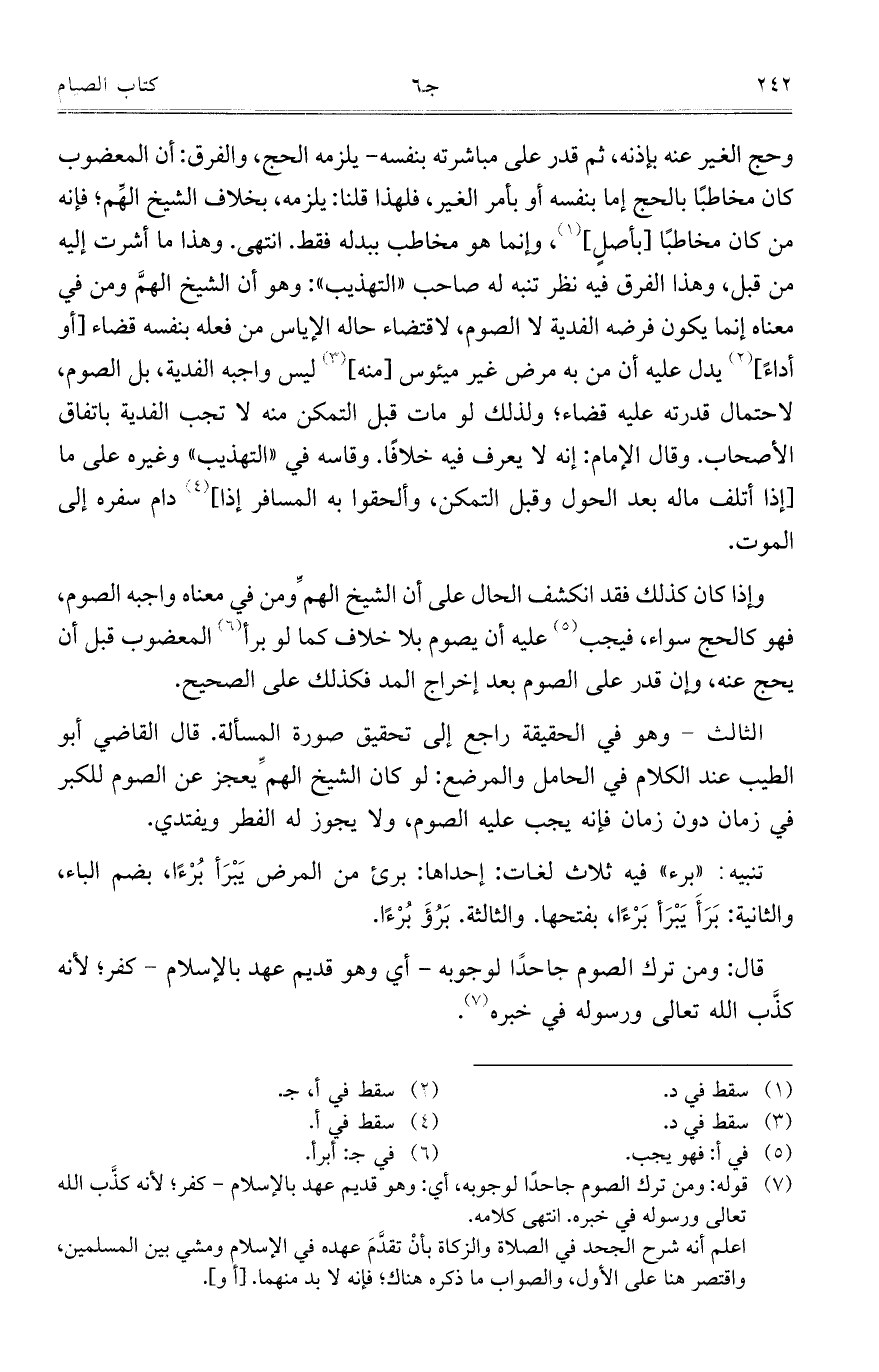 وإذا كان كذلك فقد انكشف الحال على أن الشيخ الهمِّ ومن في معناه واجبه الصوم، فهو كالحج سواء، فيجب عليه أن يصوم بلا خلاف كما لو برأ المعضوب قبل أن يحخج عنه، وإن قدر على الصوم بعد إخراج المد فكذلك على الصحيح.