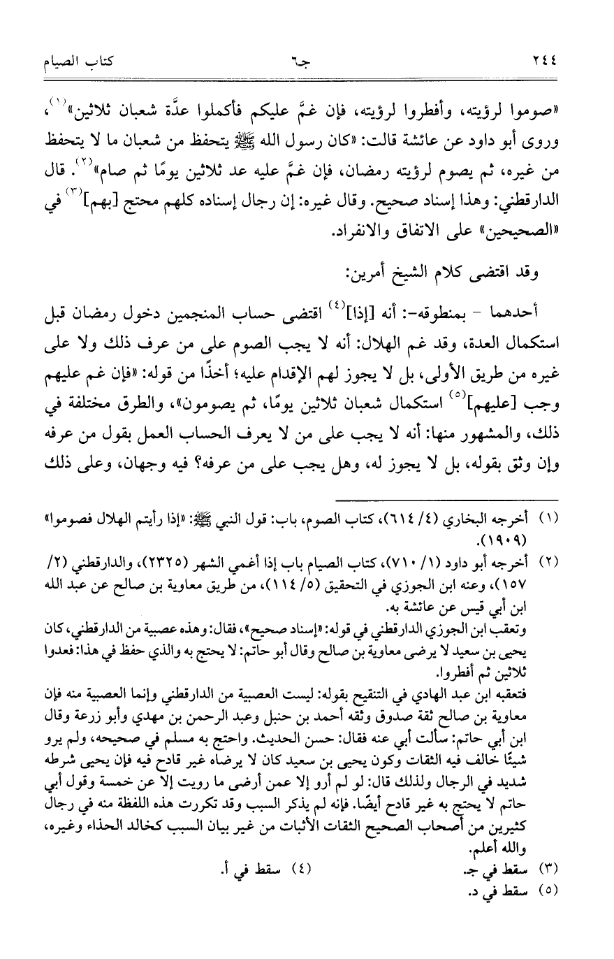 "صوموا لرؤتيه، وأفطروا لرؤيته، فإن غمَّ عليكم فأكملوا عدَّة شعبان ثلاثين"، وروى أبو داود عن عائشة قالت: "كان رسول الله صلى الله عليه وسلم يتحفظ من شعبان ما لا يتحفظ من غيره، ثم يصوم لرؤيته رمضان، فإن غمَّ عليه عد ثلاثين يوماً ثم صام". قال الدارقطني: وهذا إسناد صحيح. وقال غيره: إن رجال إسناده كلهم محتج [بهم] في "الصحيحين" على الاتفاق والانفراد.
