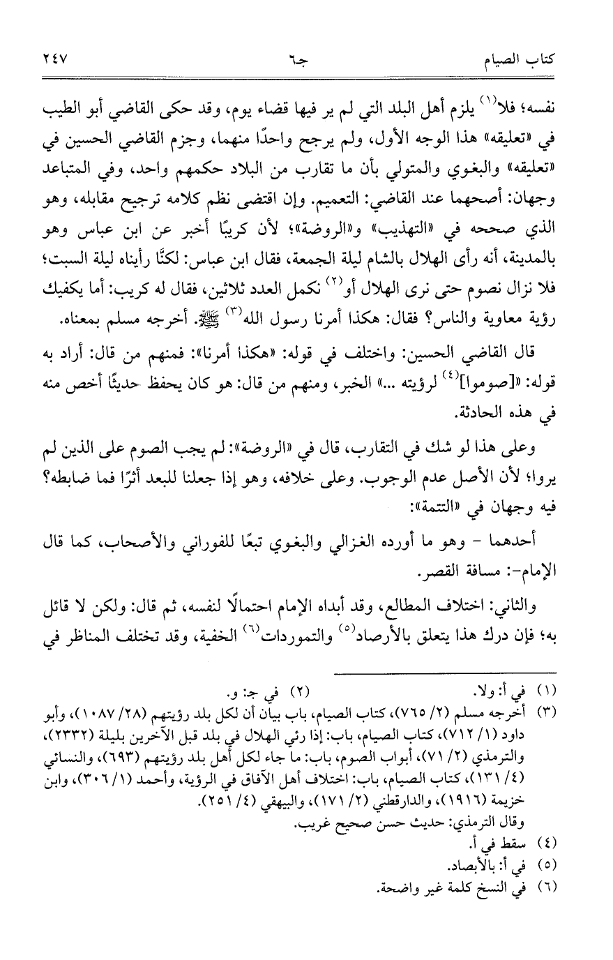 نفسه؛ فلا يلزم أهل البلد التي لم ير فيها قضاء يوم، وقد حكى القاضي أبو الطيب في "تعليقه" هذا الوجه الأول، ولم يرجح واحداً منهما، وجزم القاضي الحسين في "تعليقه" والبغوي والمتولي بأن ما تقارب من البلاد حكمهم واحد، وفي المتباعد وجهان: أصحهما عند القاضي: التعميم. وإن اقتضى نظم كلامه ترجيح مقابله، وهو الذي صححه في "التهذيب" و"الروضة"؛ لأن كريباً أخبر عن ابن عباس وهو بالمدينة، أنه رأى الهلال بالشام ليلة الجمعة، فقال ابن عباس: لكنَّا رأيناه ليلة السبت؛ فلا نزال تصوم حتى نرى الهلال أو نكمل العدد ثلاثين، فقال له كريب: أما يكفيك رؤية معاوية والناس؟ فقال: هكذا أمرنا رسول الله صلى الله عليه وسلم، أخرجه مسلم بمعناه.