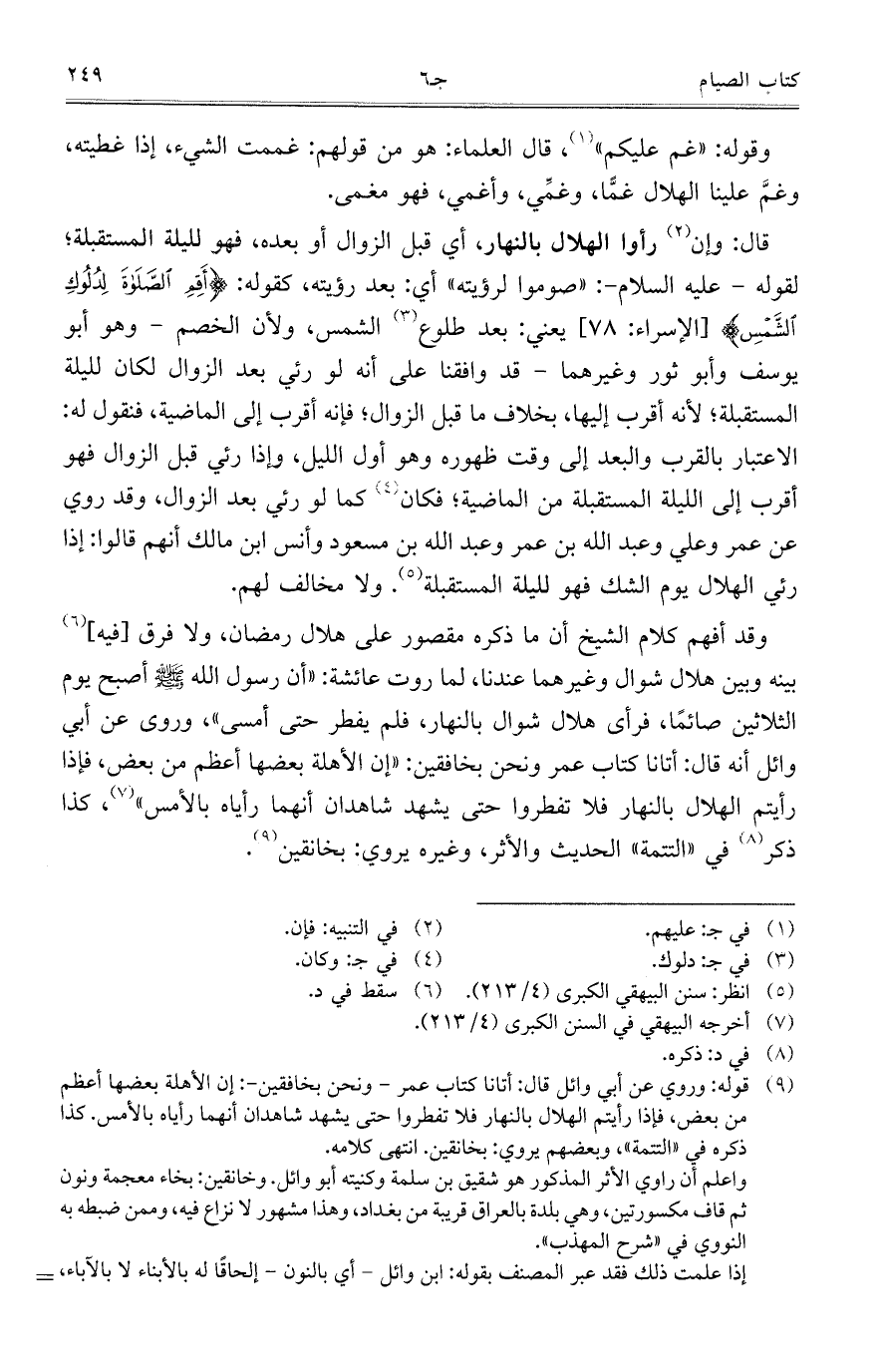 وقد أفهم كلام الشيخ أن ما ذكره مقصور على هلال رمضان، ولا فرق [فيه] بينه وبين هلال شوال وغيرهما عندنا، لما روت عائشة: "أن رسول الله صلى الله عليه وسلم أصبح يوم الثلاثين صائماً، فرأى هلال شوال بالنهار، فلم يفطر حتى أمسى"، وروى عن أب وائل أنه قال: أتانا كتاب عمر ونحن بخافقين: "إن الأهلة بعضها أعظم من بعض، فإذا رأيتم الهلال بالنهار فلا تفطروا حتى يشهد شاهدان أنهما رأياه بالأمس"، كذا ذكر في "التتمة" الحديث والأثر، وغيره يروي: بخانقين.