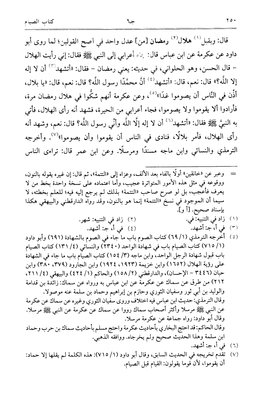 قال: ويقبل هلال رمضان [من] عدل واحد في أصح القولين؛ لما روى أبو داود عن عكرمة عن ابن عباس قال: جاء أعرابي إلى النبي صلى الله عليه وسلم فقال: إني رأيت الهلال – قال الحسن، وهو الحلواني، في حديثه: يعني رمضان – فقال: "أتشهد أن لا إله إلا الله؟ " قال: نعم، قال: "أتشهد أنَّ محمَّداً رسول الله؟ قال: نعم، قال: "يا بلال، أذِّن في النَّاس أن يصوموا غداً"، وعن عكرمة أنهم شكُّوا في هلال رمضان مرة، فأرادوا ألا يقوموا ولا يصوموا، فجاء أعرابي من الحيرة، فشهد أنه رأى الهلال، فأتى به النبي صلى الله عليه وسلم فقال: "أتشهد أن لا إله إلا الله وأنِّي رسول الله؟ قال: نعم، وشهد أنه رأى الهلال، فأمر بلالاً، فنادى في الناس أن يقوموا وأن يصوموا". وأخرجه الترمذي النسائي وابن ماجه مسنداً ومرسلاً. وعن ابن عمر قال: تراءى الناس