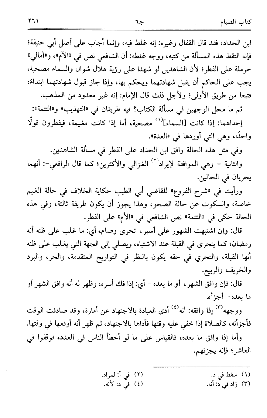 ابن الحداد، فقد قال القفال وغيره: إنه غلط فيه، وإنما أجاب على أصل أبي حنيفة؛ فإنه التقط هذه المسألة من كتبه، ووجه غلطه: أن الشافعي نص في "الأم"، و"أمالي" حرملة على الفطر؛ لأن الشاهدين لو شهدا على رؤية هلال شوال والسماء مصحية، يجب على الحاكم أن يقبل شهادتهما ويحكم بها، وإذا جاز قبول شهادتهما ابتداءً؛ فتبعا من طريق الأولى؛ ولأجل ذلك قال الإمام: إنه غير معدود من المذهب.