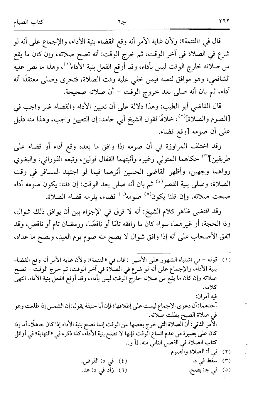 وقد اختلف المراوزة في أن صومه إذا وافق ما بعده وقع أداء أو قضاء على طريقين] حكاهما المتولي وغيره وأثبتهما القفال قولين، وتبعه الفوراني، والبغوي رواهما وجهين، وأظهر القاضي الحسين أثرهما فيما لو اجتهد المسافر في وقت الصلاة، وصلى بنية القصر ثم بان أنه صلى بعد الوقت: إن قلنا: يكون صومه أداء صحت صلاته. وإن قلنا يكون صومه قضاء، يلزمه قضاء الصلاة.