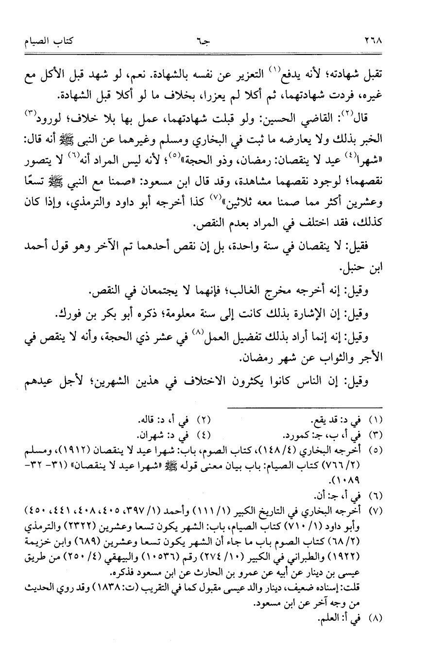 قال: القاضي الحسين: ولو قبلت شهادتهما، عمل بها بلا خلاف؛ لورود الخبر بذلك ولا يعارضه ما ثبت في البخاري ومسلم وغيرهما عن النبي صلى الله عليه وسلم أنه قال: "شهرا عيد لا ينقصان: رمضان، وذو الحجة"؛ لأنه ليس المراد أنه لا يتصور نقصهما؛ لوجود نقصهما مشاهدة، وقد قال ابن مسعود: "صمنا مع النبي صلى الله عليه وسلم تسعاً وعشرين أكثر مما صمنا معه ثلاثين" كذا أخرجه أبو داود والترمذي، وإذا كان كذلك، فقد اختلف في المراد بعدم النقص.