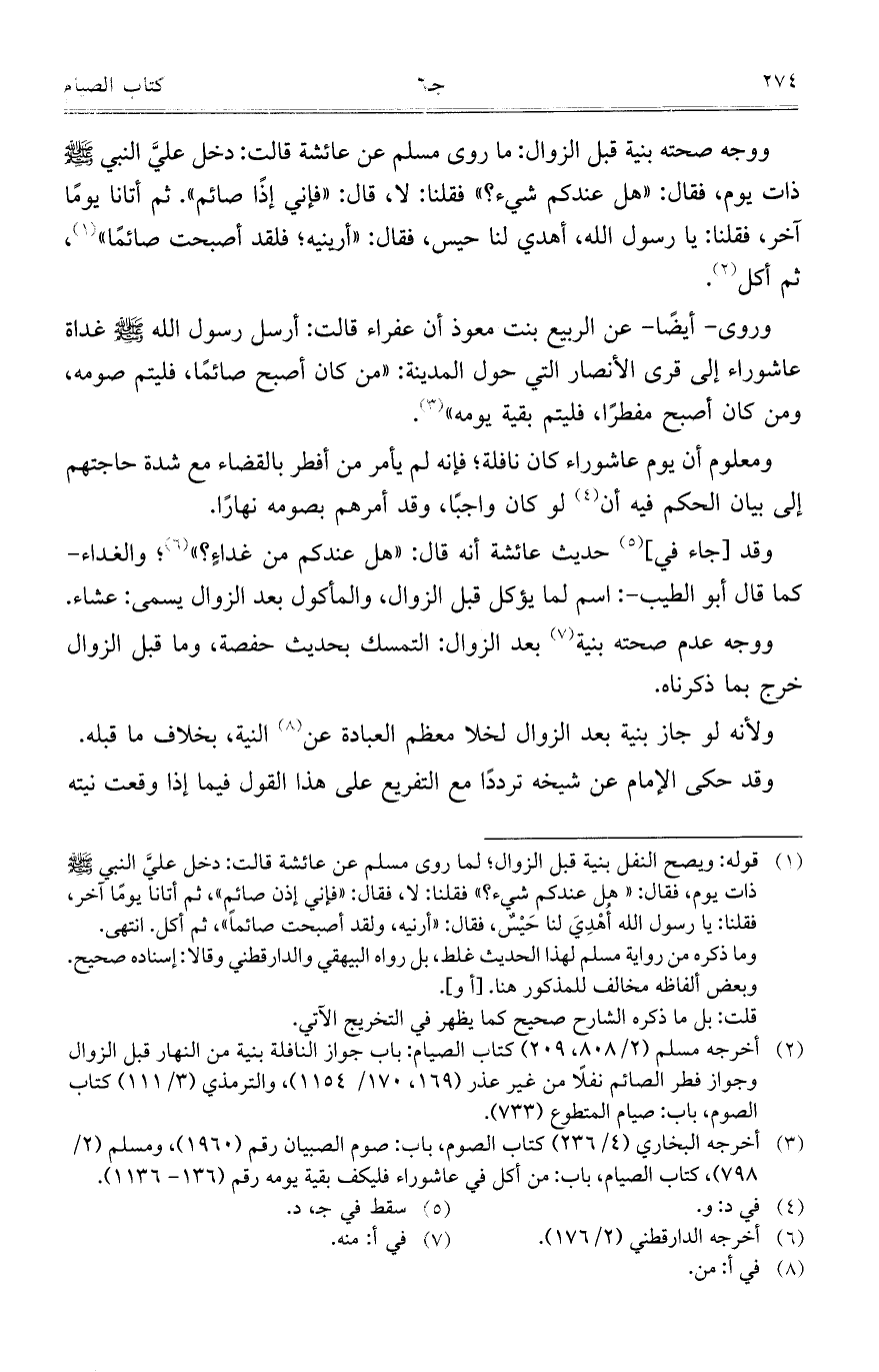 ووجه صحته بنية قبل الزوال: ما روى مسلم عن عائشة قالت: دخل عليَّ النبي صلى الله عليه وسلم ذات يوم، فقال: "هل عندكم شيء؟ " فقلنا: لا، قال: "فإني إذاً صائم". ثم أتانا يوماً آخر، فقلنا: يا رسول الله، أهدي لنا حيس، فقال: "أرينيه؛ فلقد أصبحت صائماً"، ثم أكل.