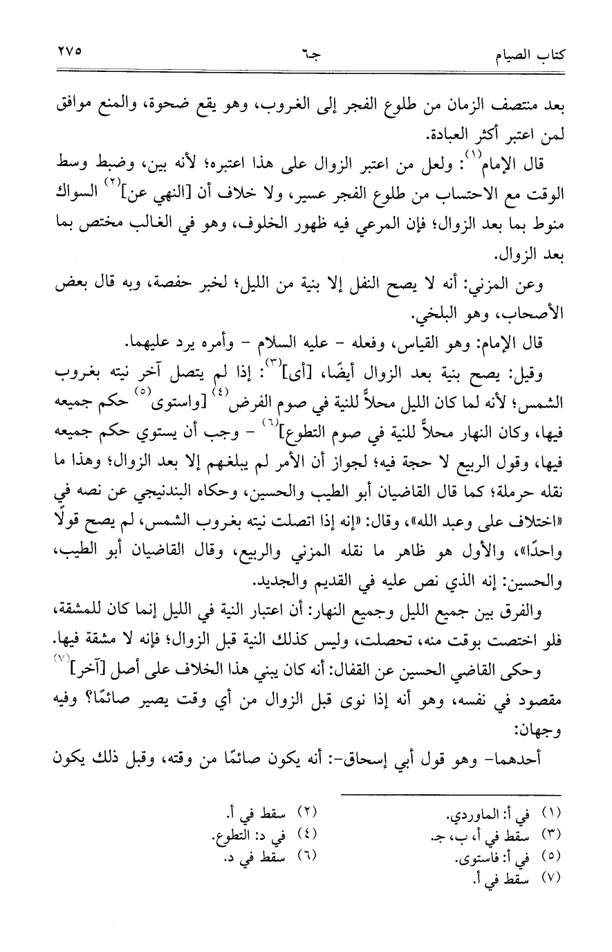 وقيل: يصح بنية بعد الزوال أيضاً؛ [أي]: إذا لم يتصل آخر نيته بغروب الشمس؛ لأنه لما كان الليل محلاً للنية في صوم الفرض [واستوى حكم جميعه فيها، وكان النهار محلاً للنية في صوم التطوع] – وجب أن يستوي حكم جميعه فيها، وقول الربيع لا حجة فيه؛ لجواز أن الأمر لم يبلغهم إلا بعد الزوال؛ وهذا ما نقله حرملة؛ كما قال القاضيان أبو الطيب والحسين، وحكاه البندنيجي عن نصه في "اختلاف على وعبد الله"، وقال: "إنه إذا اتصلت نيته بغروب الشمس، لم يصح قولاً واحداً"، والأول هو ظاهر ما نقله المزني والربيع، وقال القاضيان أبو الطيب، والحسين: إنه الذي نص عليه في القديم والجديد.