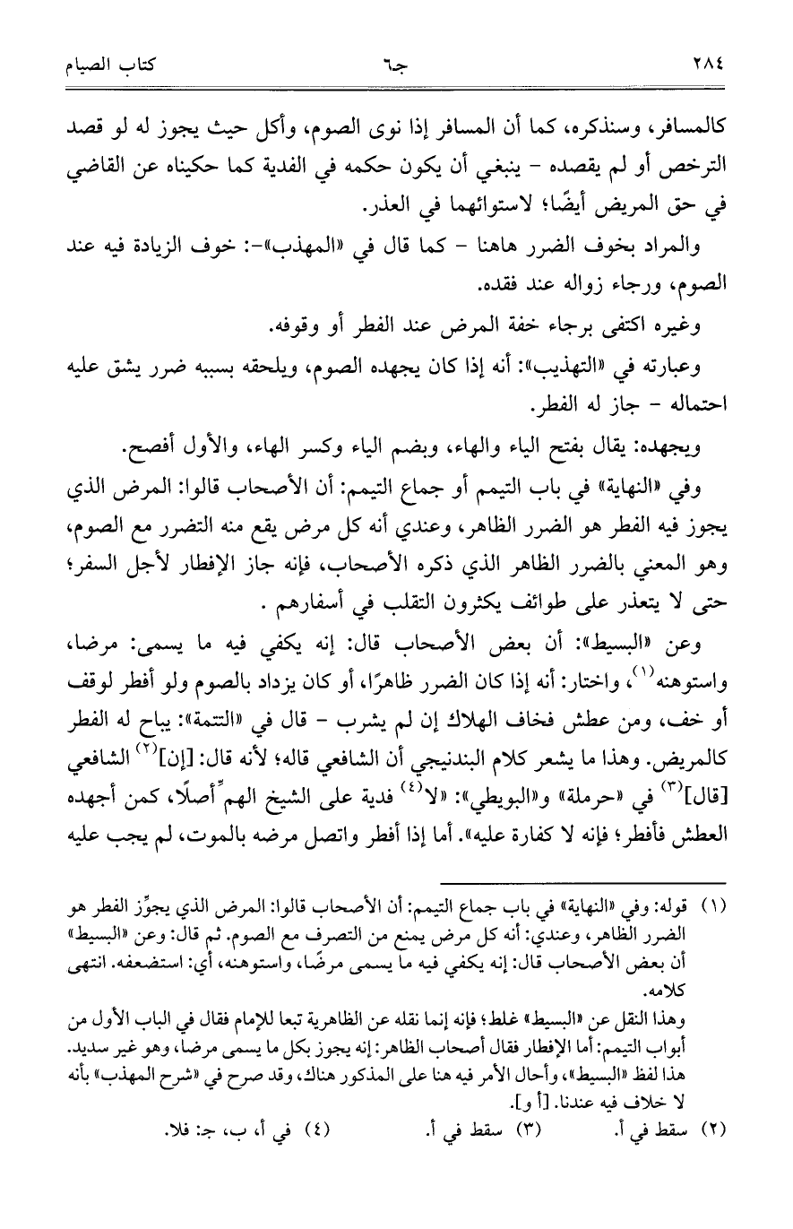وفي "النهاية" في باب التيمم أو جماع التيمم: أن الأصحاب قالوا: المرض الذي يجوز فيه الفطر هو الضرر الظاهر، وعندي أنه كل مرض يقع منه التضرر مع الصوم، وهو المعني بالضرر الظاهر الذي ذكره الأصحاب، فإنه جاز الإفطار لأجل السفر؛ حتى لا يتعذر على طوائف يكثرون التقلب في أسفارهم.