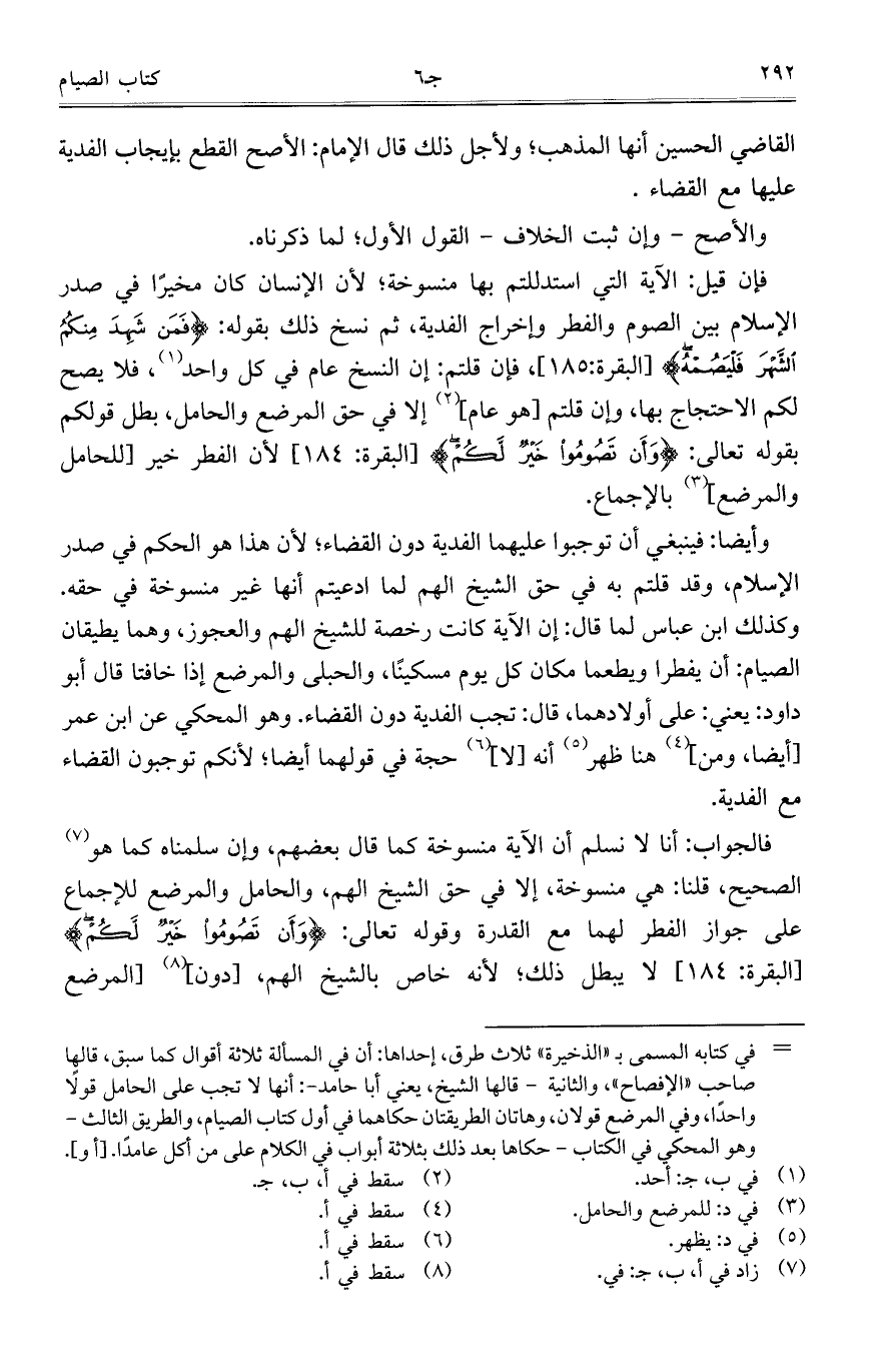 فإن قيل: الآية التي استدللتم بها منسوخة؛ لأن الإنسان كان مخيراً في صدر الإسلام بين الصوم والفطر وإخراج الفدية، ثم نسخ ذلك بقوله: {فَمَنْ شَهِدَ مِنْكُمْ الشَّهْرَ فَلْيَصُمْهُ} [البقرة: 185]، فإن قلتم: إن النسخ عام في كل واحد، فلا يصح لكم الاحتجاج بها، وإن قلتم [هو عام] إلا في حق المرضع والحامل، بطل قولكم بقوله تعالى: {وَأَنْ تَصُومُوا خَيْرٌ لَكُمْ} [البقرة: 184] لأن الفطر خير [للحامل والمرضع] بالإجماع.