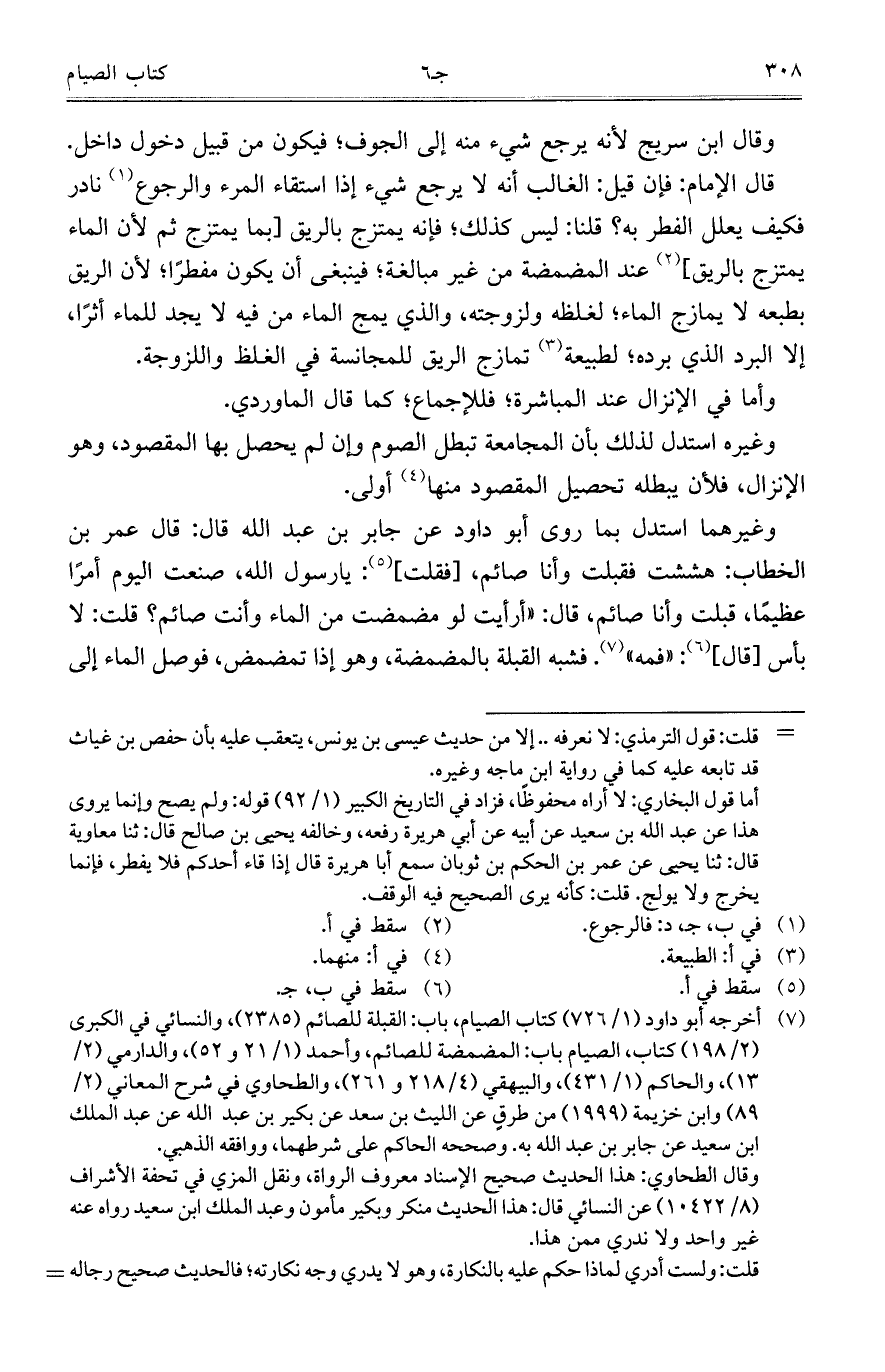وغيرهما استدل بما روى أبو داود عن جابر بن عبد الله قال: قال عمر بن الخطاب: هششت فقبلت وأنا صائم، [فقلت]: يا رسولا لله، صنعت اليوم أمراً عظيماً، قبلت وأنا صائم، قال: "أرأيت لو مضمضت من الماء وأنت صائم؟ قلت: لا بأس [قال]: "فمه". فشبه القبلة بالمضمضة، وهو إذا تمضمض، فوصل الماء إلى