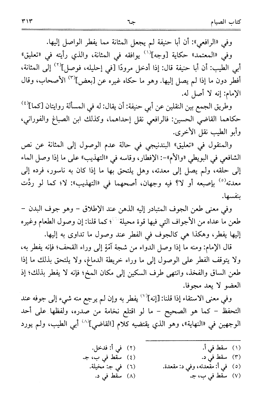 قال الإمام: ومنه ما إذا وصل الدواء من شجة أمّةٍ إلى وراء القحف؛ فإنه يفطر به، ولا يتوقف الفطر على الوصول إلى ما وراء خريطة الدماغ، ولا يلتحق بذلك ما إذا طعن الساق والفخذ، وانتهى طرف السكين إلى مكان المخ؛ فإنه لا يفطر بذلك؛ إذ العضو لا يعد مجوفاً.