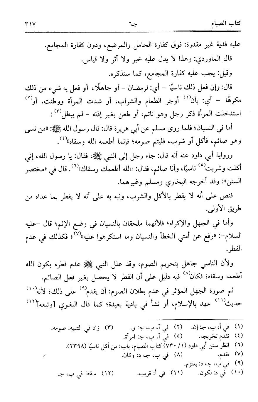 ورواية أبي داود عنه أنه قال: جاء رجل إلى النبي صلى الله عليه وسلم، فقال: يا رسول الله، إني أكلت وشربت ناسياً، وأنا صائم، فقال: "الله أطعمك وسقاك". قال في "مختصر السنن": وقد أخرجه البخاري ومسلم وغيرهما.