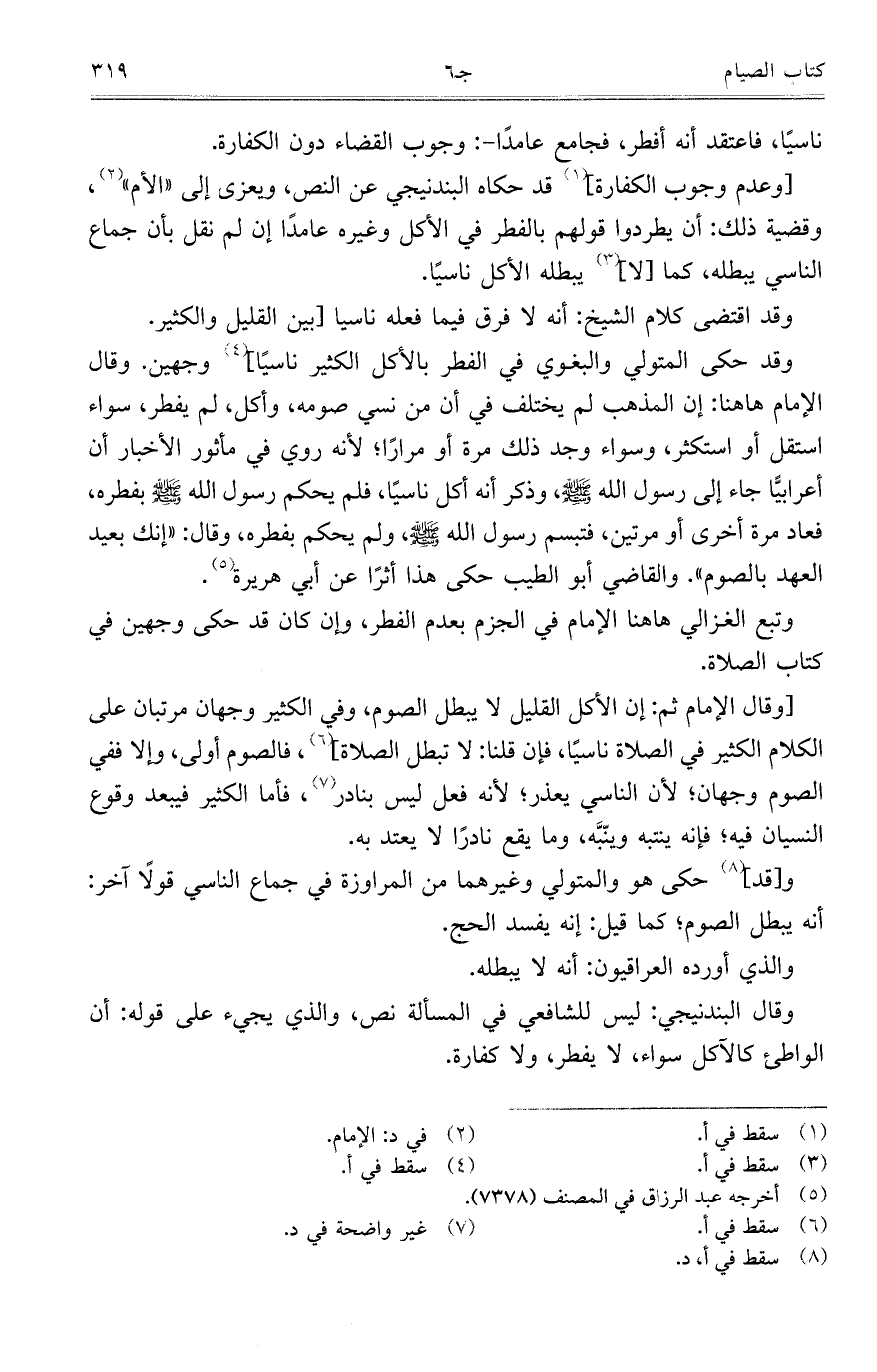 [وقال الإمام ثم: إن الأكل القليل لا يبطل الصوم، وفي الكثير وجهان مرتبان على الكلام الكثير في الصلاة ناسياً، فإن قلنا: لا تبطل الصلاة]، فالصوم أولى، وألا ففي الصوم وجهان؛ لأن الناسي يعذر؛ لأنه فعل ليس بنادر، فأما الكثير فيبعد وقوع النسيان فيه؛ فإنه ينتبه وينَّبه، وما يقع نادراً لا يعتد به.