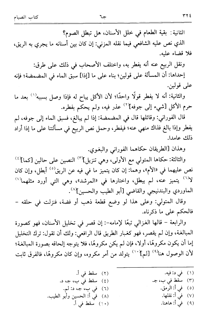 والرابعة – قالها الغزالي تبعاً لإمامه -: إن قصر في تخليل الأسنان، فهو كصورة المبالغة، وإن لم يقصر، فهو كغبار الطريق قال الرافعي: ولك أن تقول: ترك التخليل إما أن يكون مكروهاً، أو لا، فإن لم يكن مكروهاً، فلا يتوجه إلحاقه بصورة المبالغة؛ لأن الوصول هنا [لم] يتولد من أمر مكروه، وإن كان مكروهاً، فالفرق ثابت